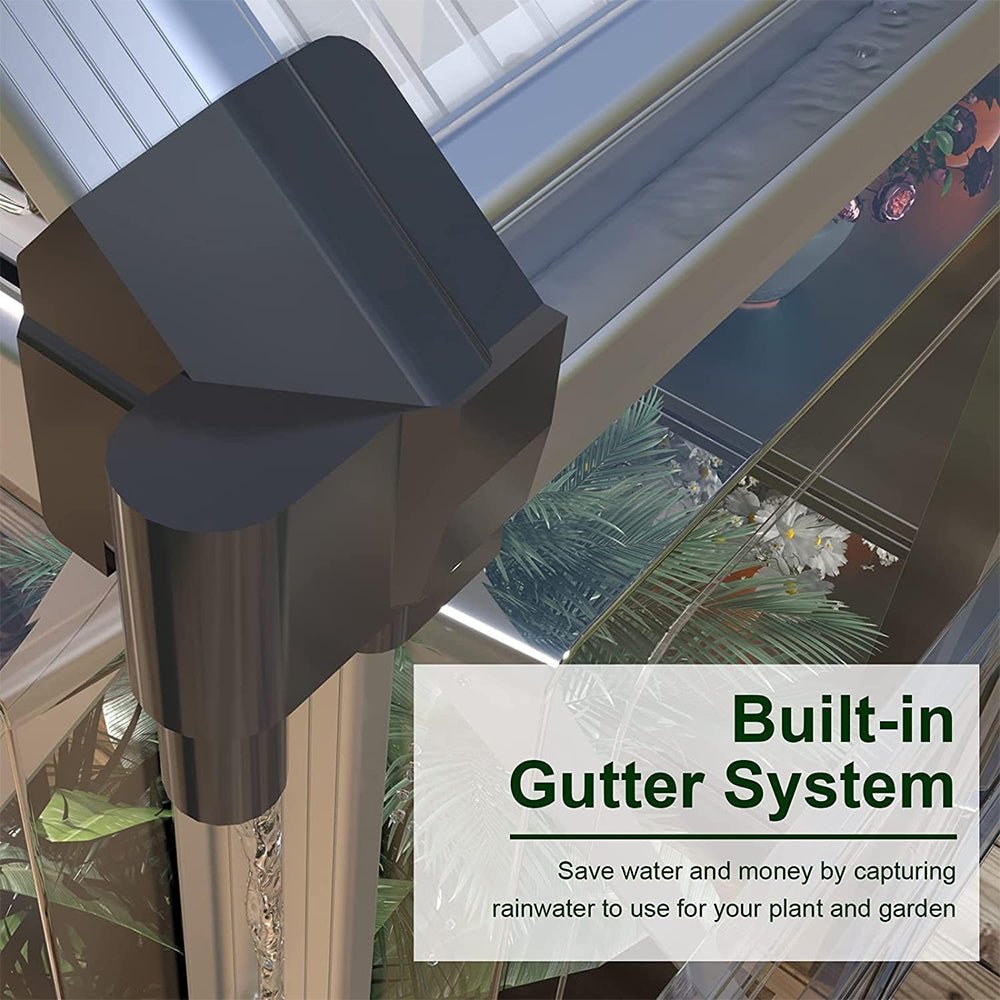 • This walk-in greenhouse offers enhanced water drainage and collection on each side. Connect a hose to bring in the rain to enrich your plants in the hot house!