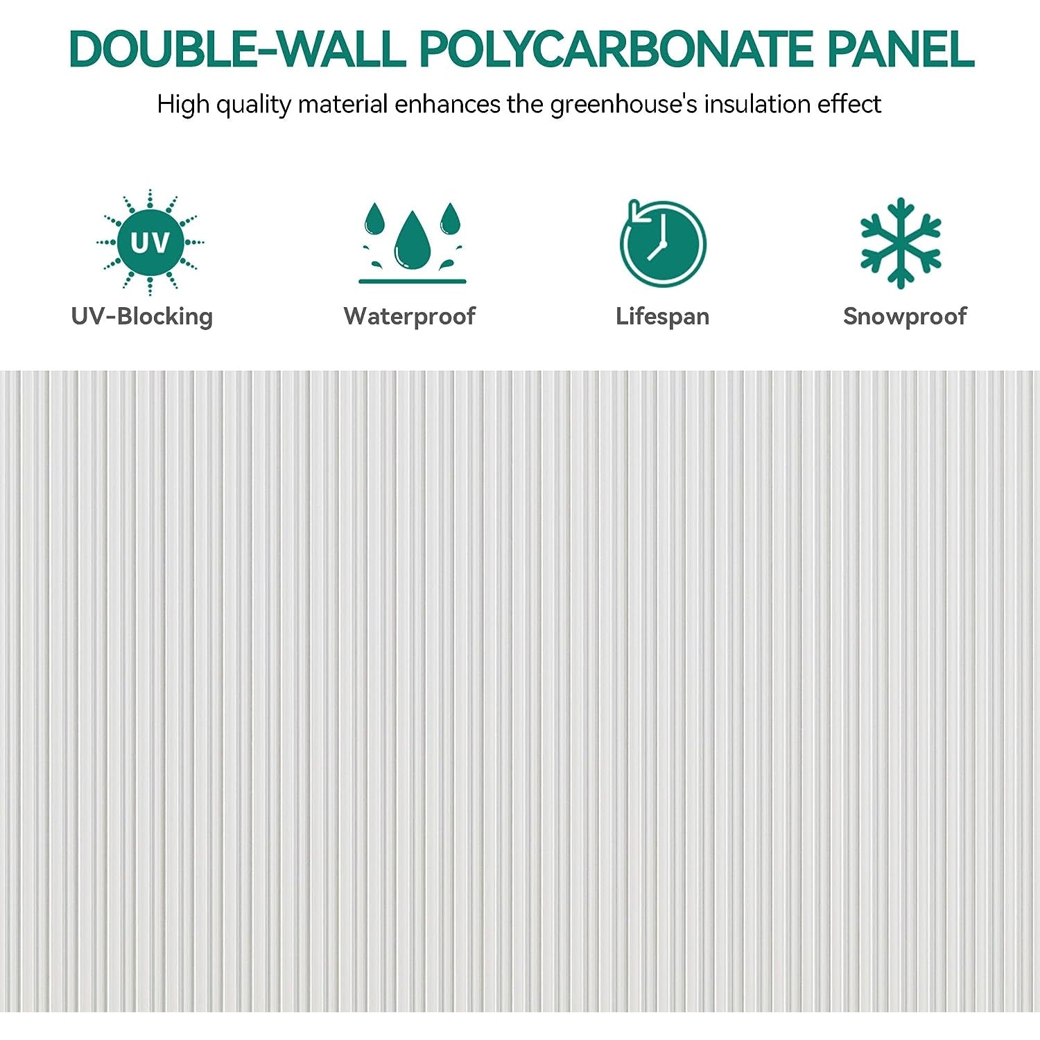 Experience the security of having your plants safely in this amazing Large Polycarbonate Aluminum Greenhouse! The durable aluminum alloy frame and reinforcing rods on the sides, paired with the double-wall polycarbonate boards, ensure superior UV protection. This sturdy greenhouse also has adjustable skylights to ensure optimal ventilation and cooling - ideal for cultivating and protecting plants year-round.
