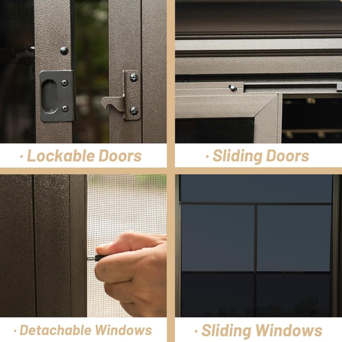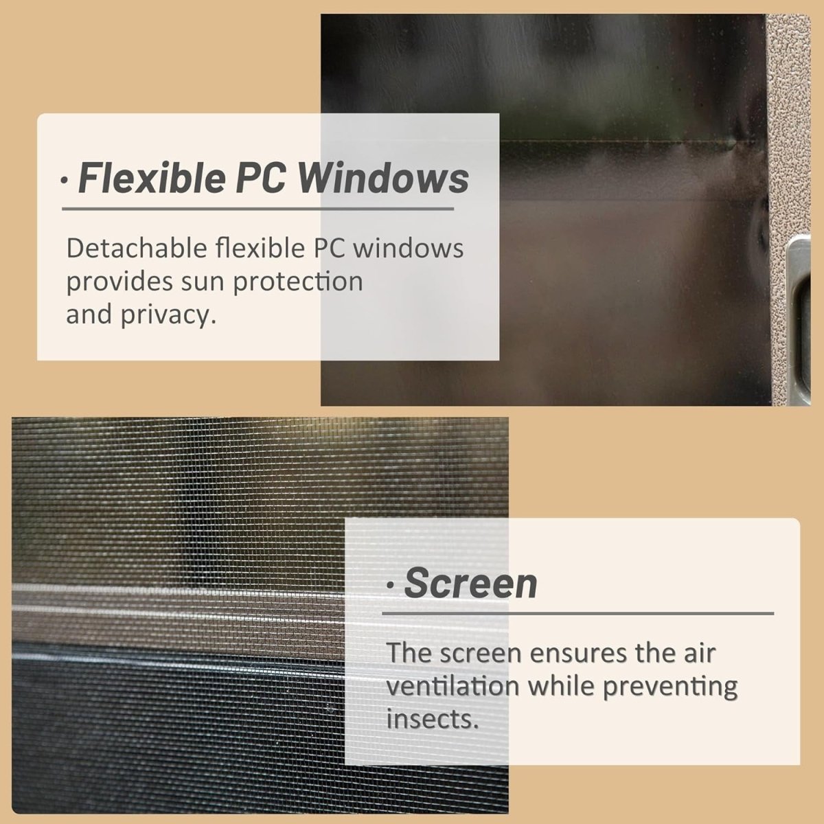 • Feartures mesh screens, allowing you to enhance your outdoor retreat even with the PVC windows removed. Keep pesky bugs at bay, creating a safe and serene outdoor haven for your leisure moments.