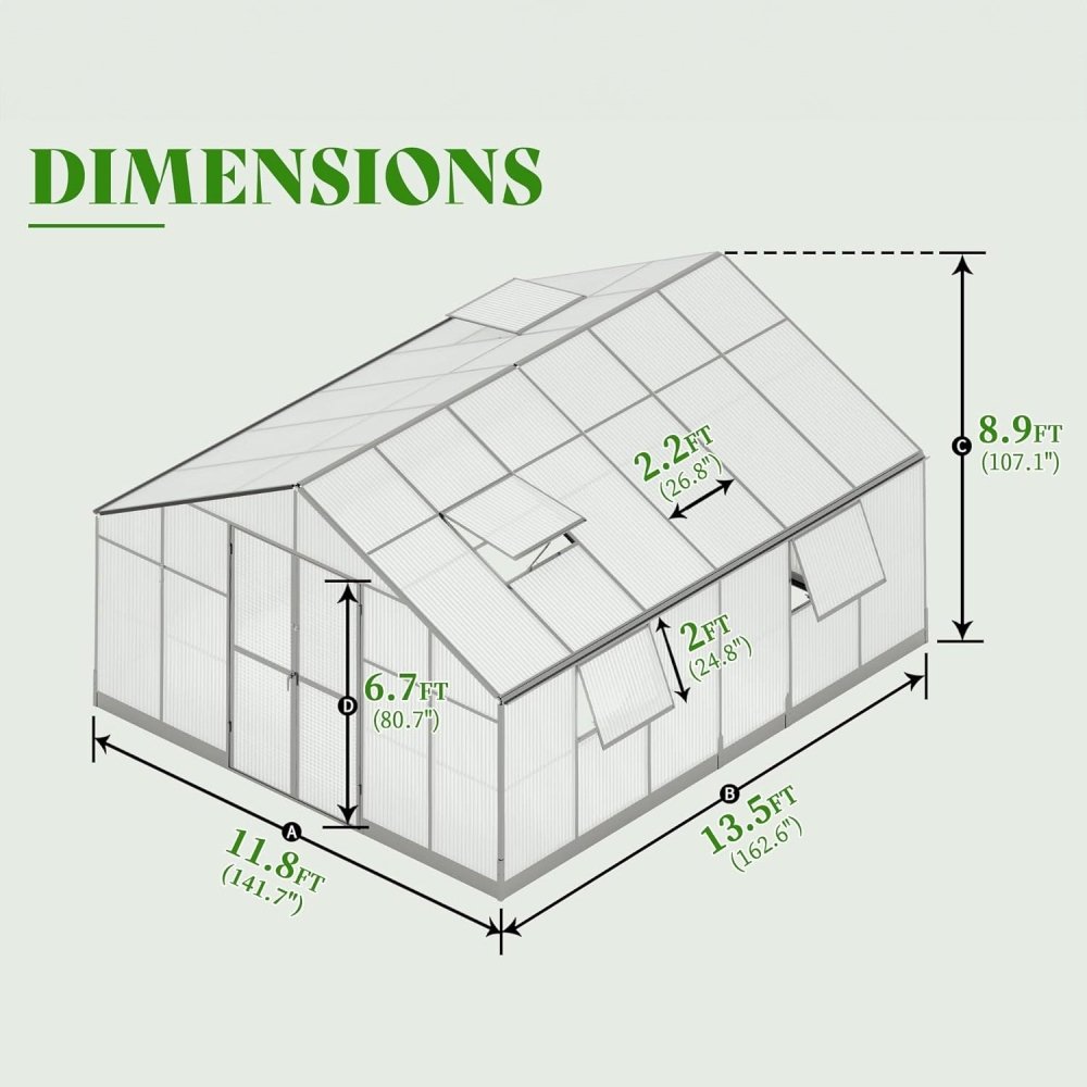 [12x13.5FT] Premium Extra Large Outdoor Aluminum Poylcarbonate Greenhouse With Quick Connect Fitting (94263715)