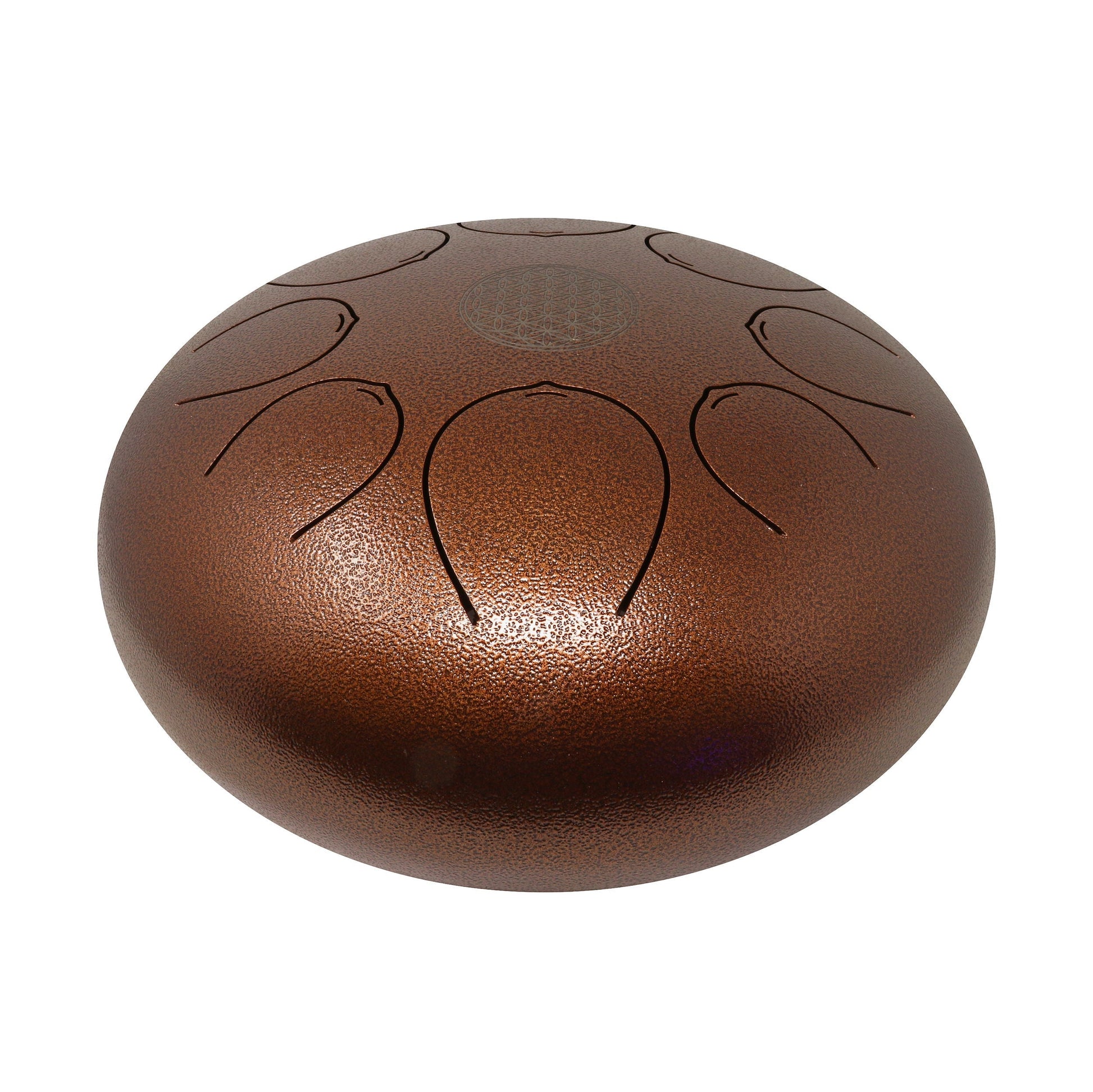 This metal red tongue drum is a versatile addition to any space. The flower of life symbol in the center creates a serene ambiance, perfect for meditation or relaxation. With the included travel bag, take it anywhere. The cutouts, shaped like tongues, make it easy for anyone to play, without any musical background. Finger sticks are available for those who prefer. The flower of life symbol represents the cycle of creation. Overall, this is a great product that provides relaxation and stress relief.
