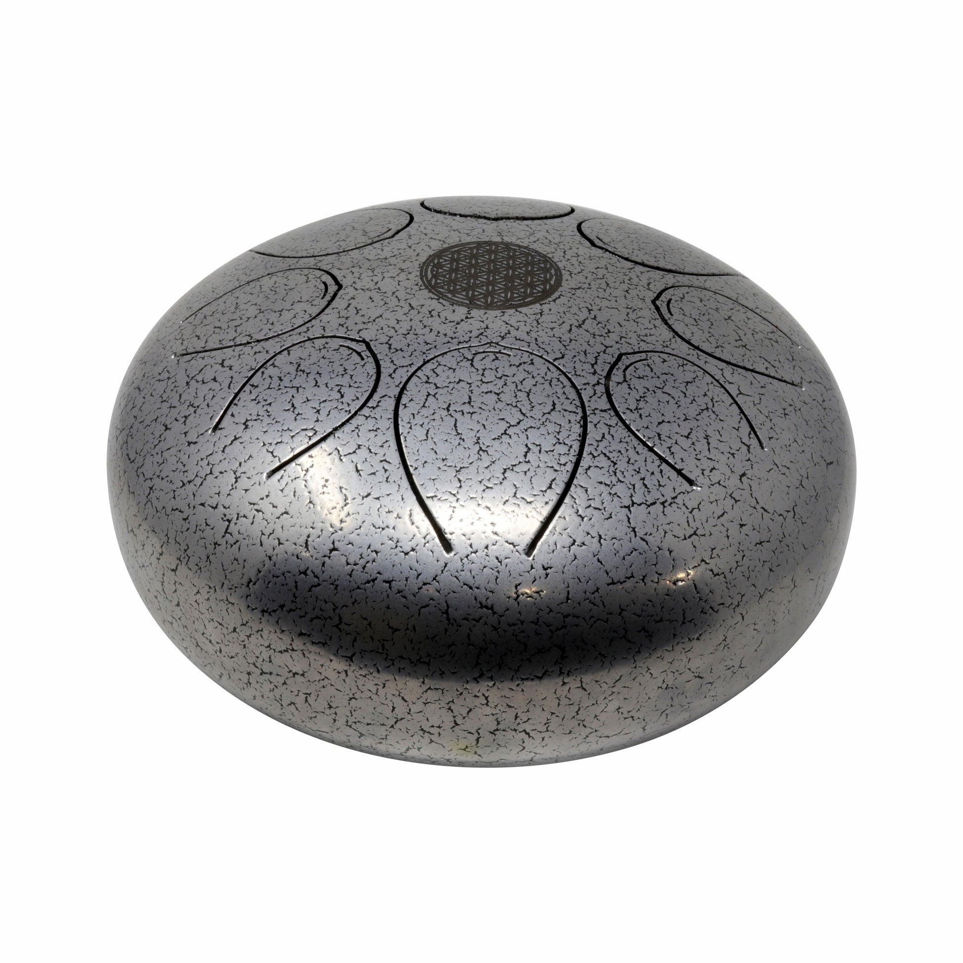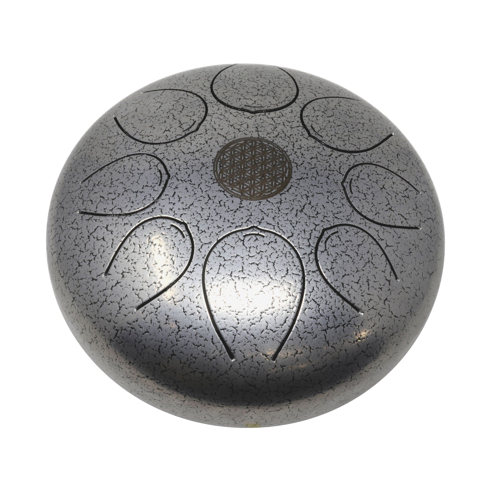 Introducing our Silver tongue drum, featuring deep rich tones and a subtle yet strong appearance. Perfect for any work space or home, it showcases a burnished flower of life symbol at its center. With a travel bag/backpack included, you can enjoy it anywhere. This intuitive instrument requires no particular skill to play, making it accessible to anyone seeking its meditative benefits. Simply pick up the mallets and hit the inside cutouts shaped like a tongue. You can also use finger sticks to avoid calluses. Lose yourself in the music and tune out the world for a while.