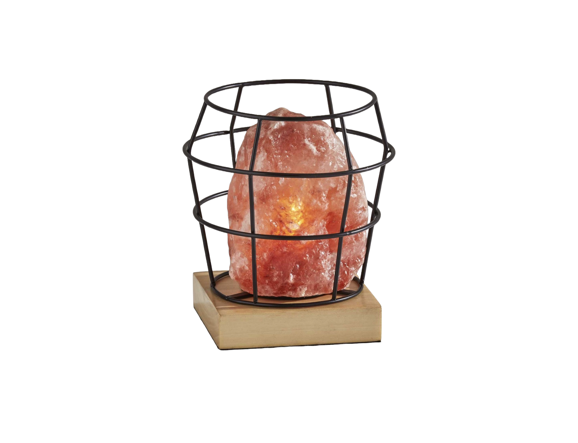 With this 8-inch Himalayan salt accent lamp with black cage shade you can bring in design to any space along with adding some ambient lighting. Includes a black metal, cage shaped shade and a wooden block base giving this salt lamp a modern industrial vibe. This mini lamp is a great way to bring the benefits of Himalayan sea salt to your space in an updated and fashionable way. 8-inch H x 7-inch W x 7-inch D