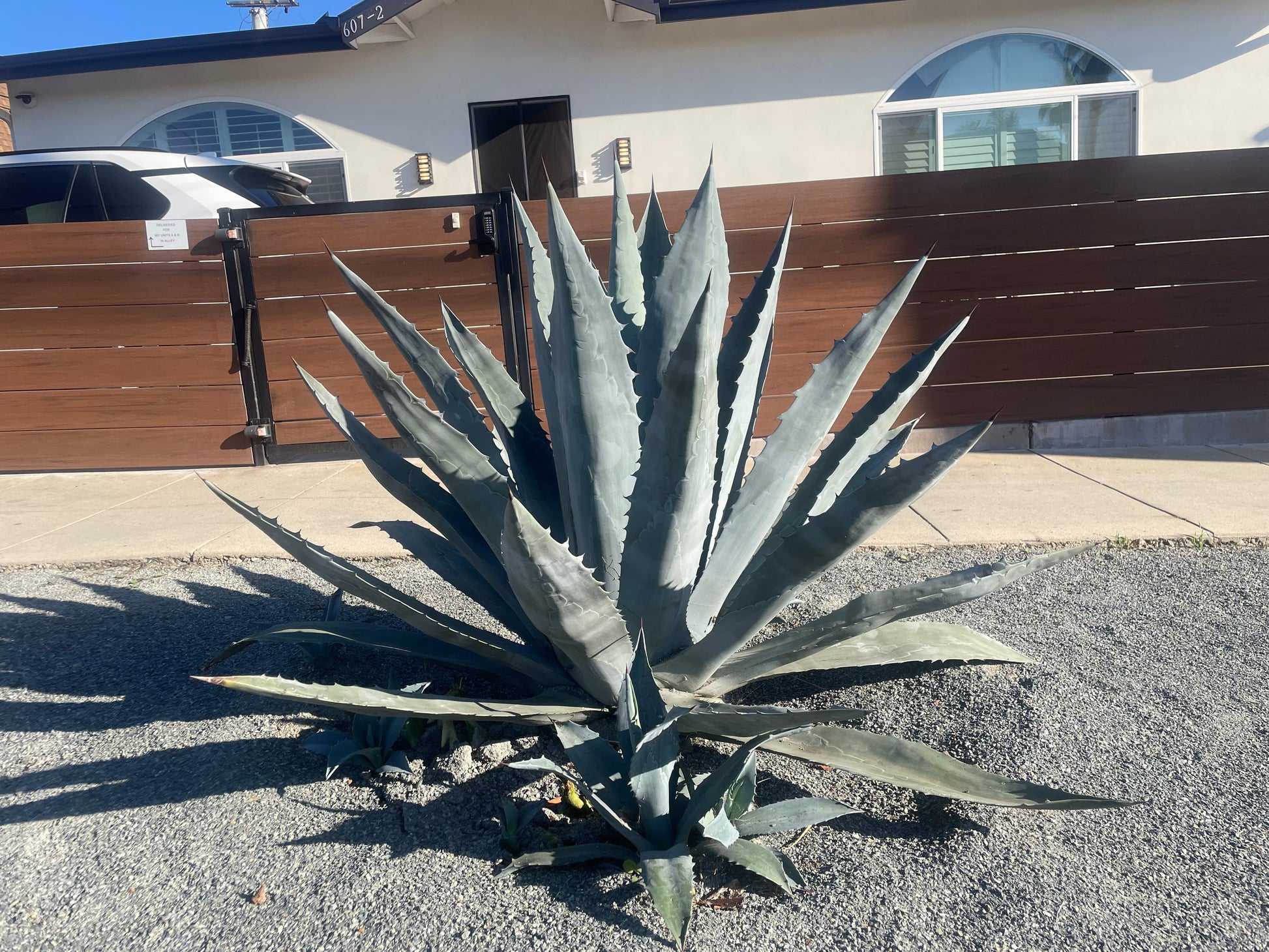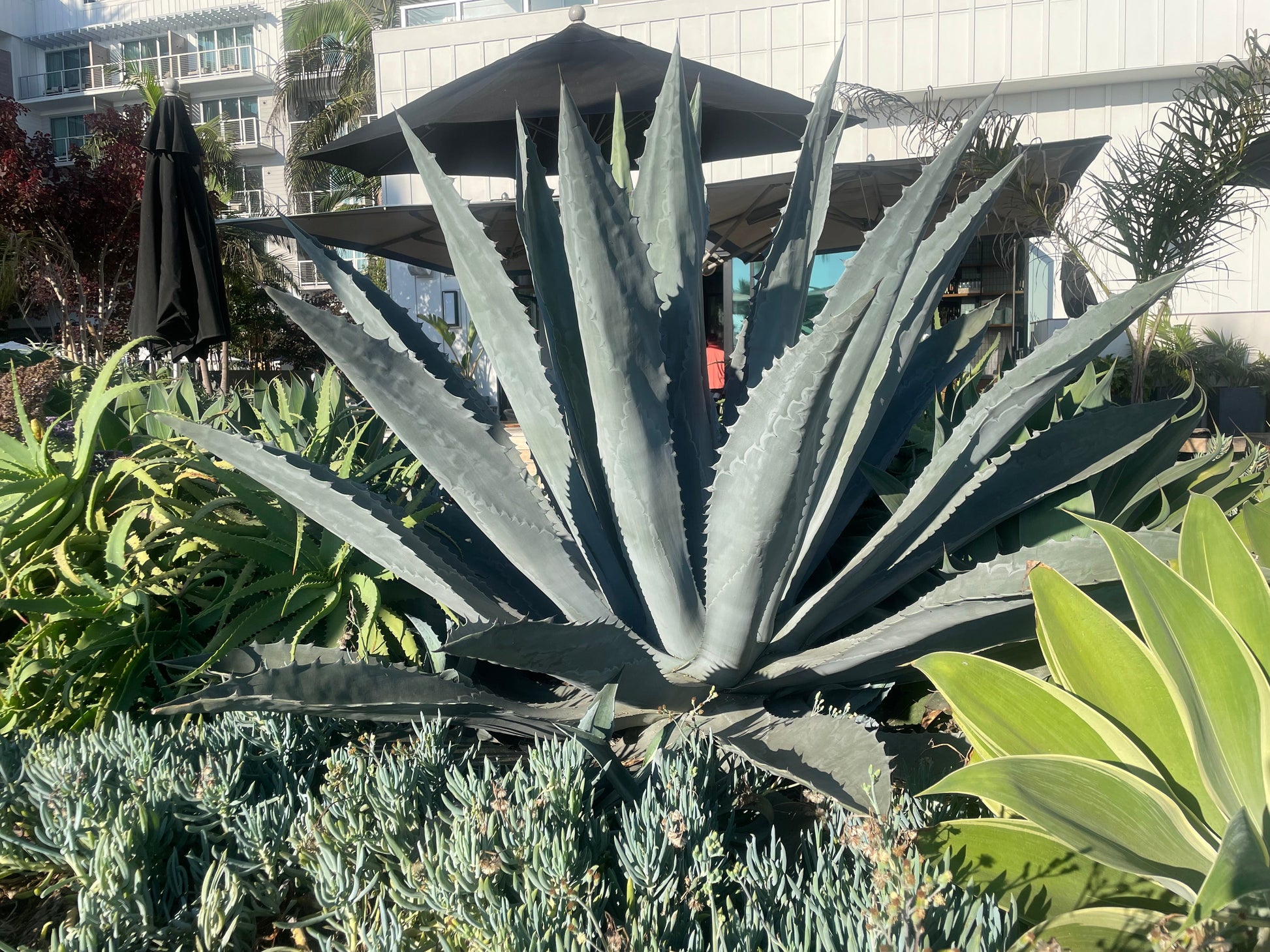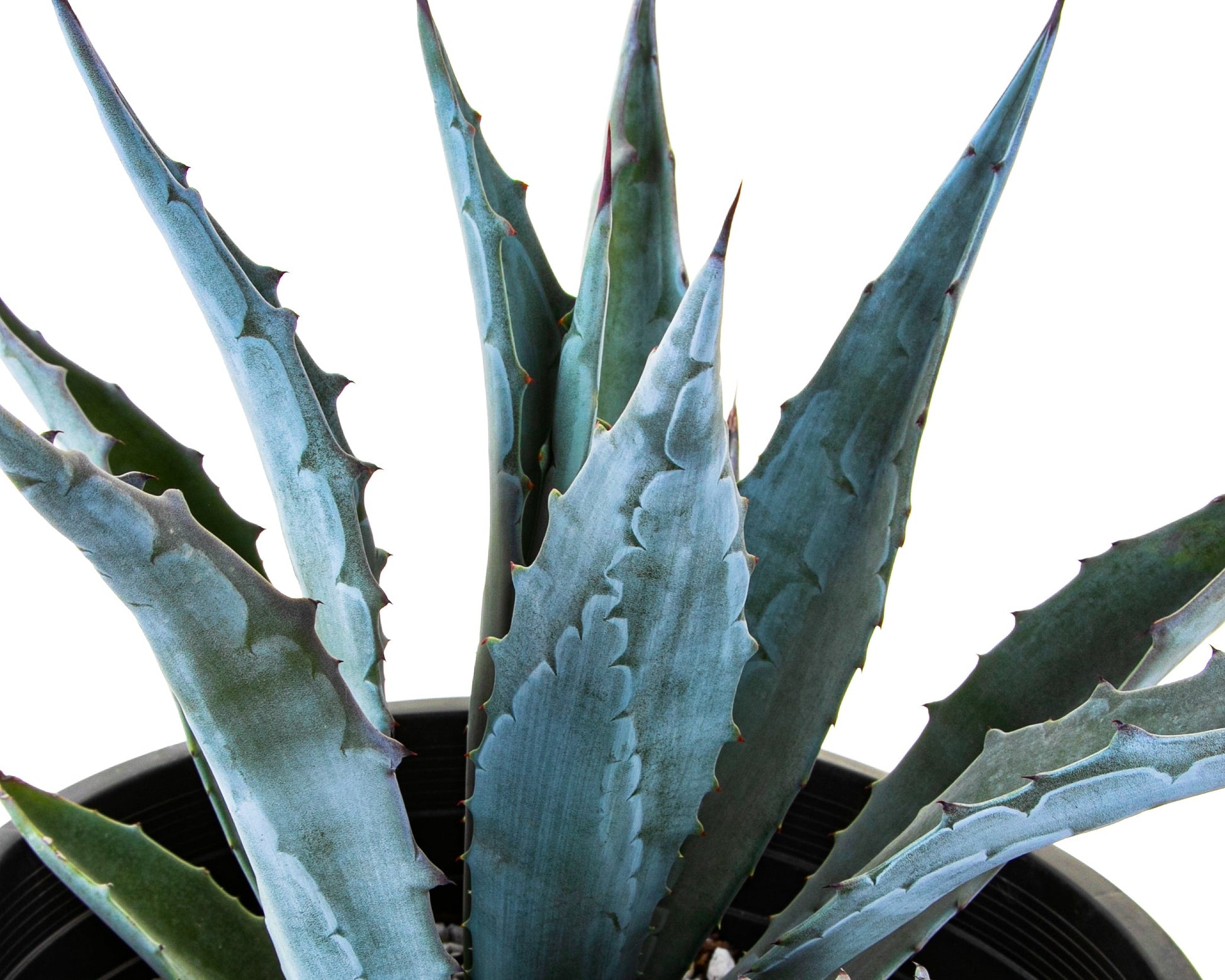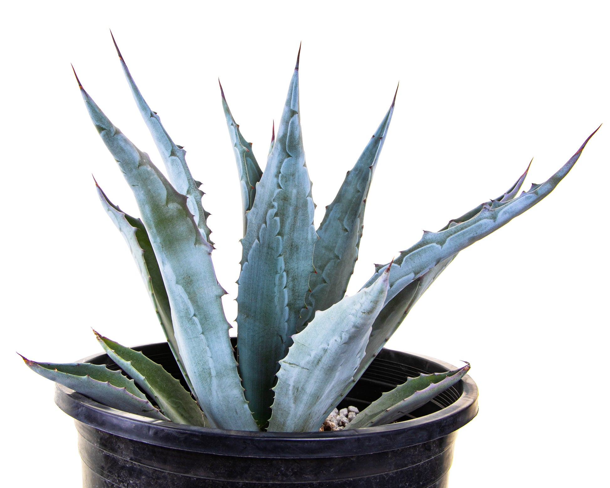 Agave americana, commonly known as the century plant, is a large succulent plant species that is native to Mexico, but has been widely cultivated around the world. It is a robust and drought-tolerant plant that can adapt to a wide range of growing conditions, but it thrives in full sun and well-drained soil. At maturity, Agave americana typically forms a massive rosette of blue-green leaves that can reach up to 6-8 feet tall and wide.  his agave species is hardy to about 15°F and is a popular choice for landscaping, particularly in arid and semi-arid regions, due to its striking architectural form and low water requirements.