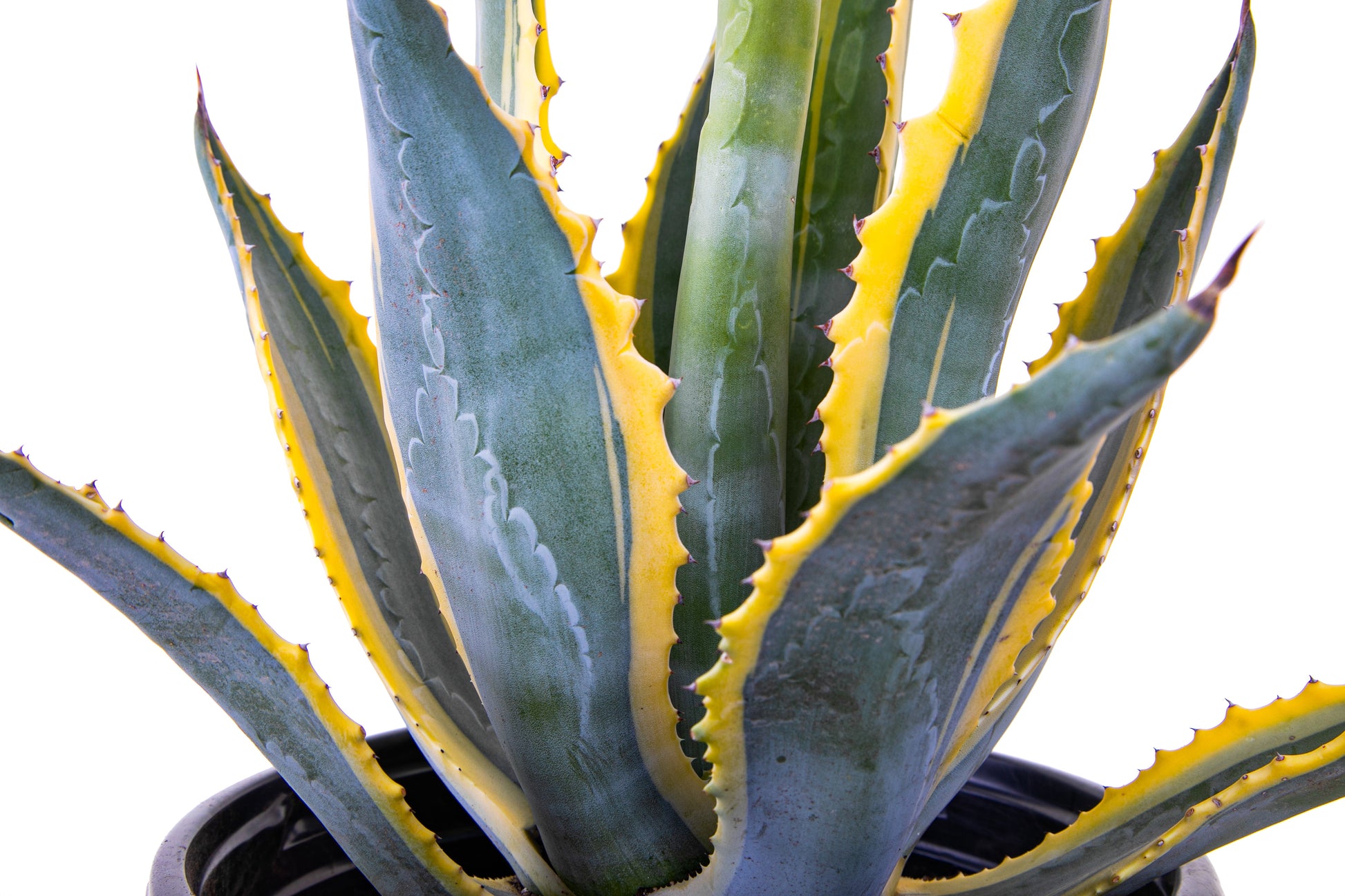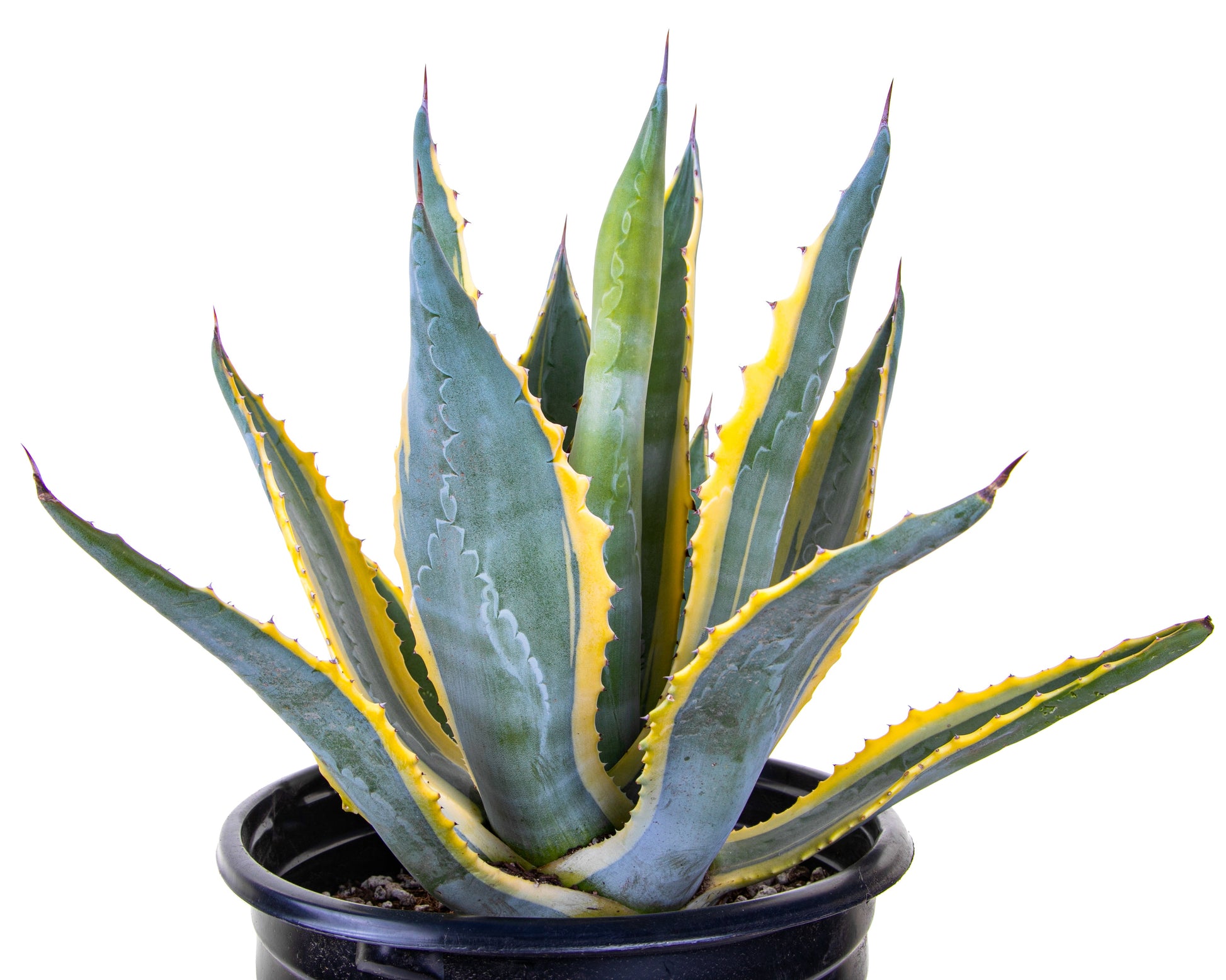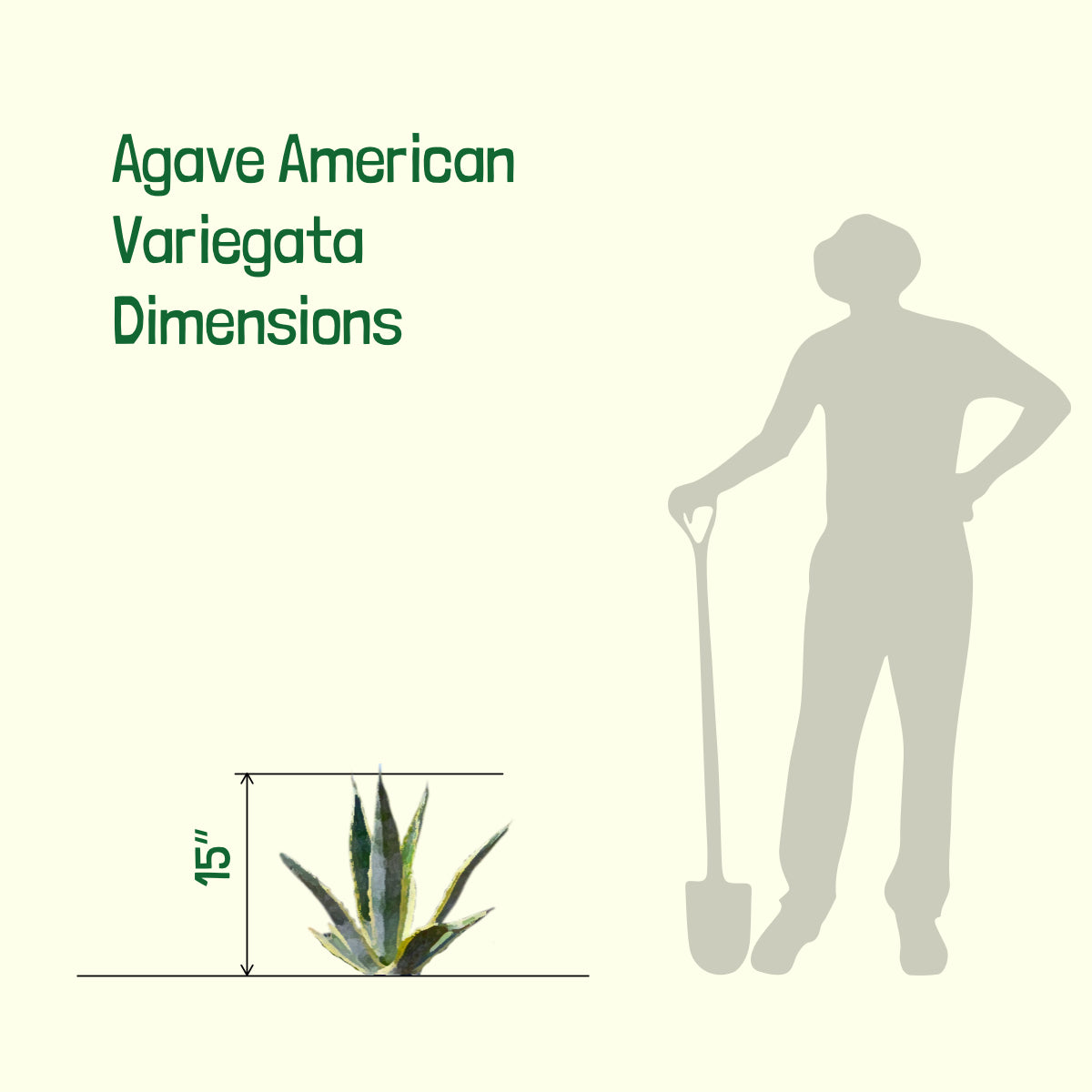 Large green and yellow variegated agave.  Does off set at a moderate rate.  Reliably cold hardy to nights in the mid twenties.  Mature size of 5'x5' in the ground.  Grows slower and to a smaller size when planted in a decorative pot.