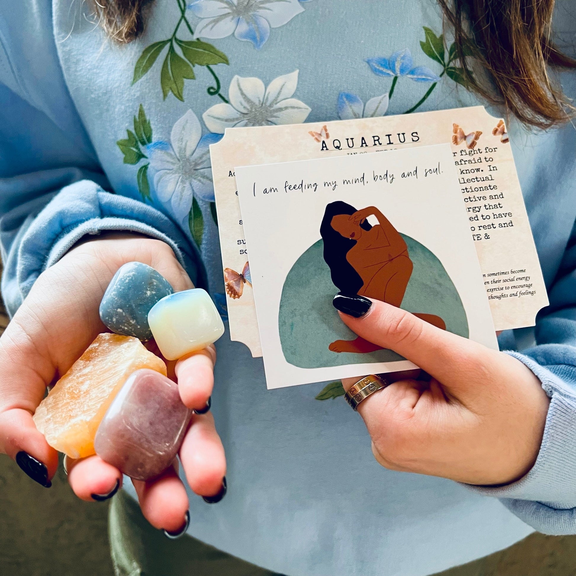 A Crystal Set designed specially to accompany and enhance the characteristics of the ever poetic Aquarius. In this set you will find an Orange Calcite Crystal for Energy and Motivation, a Lavender Quartz Tumbled for Gentleness and Calming, an Opalite Cube for Youthful Optimism, and an Angelite Stone Tumble for Spiritual Awareness.