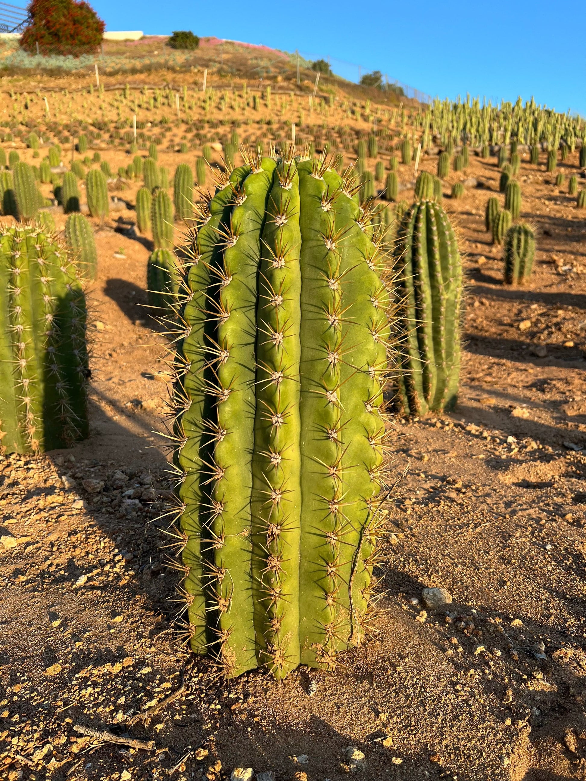The Echinopsis terscheckii commonly known as the Argentine Saguaro is native to Argentina and drought tolerant. The Argentine Saguaro thrives in hot, arid climates, and produces large white flowers. This cactus has thick ribbed green stems and golden spines, over time can develop multiple arms. Makes for a stunning focal point to any garden or landscape.Ā