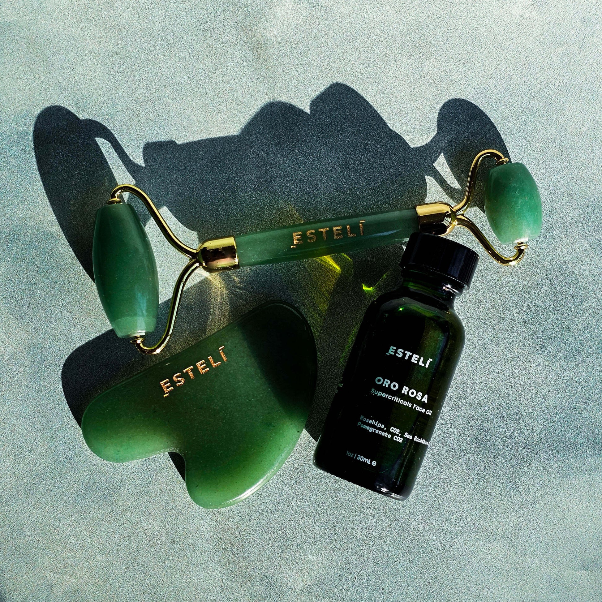 Indulge in radiant beauty with the Esteli Body Aventurine + Oro Facial Ritual Set, a luxurious trio featuring a Green Aventurine Facial Roller, Green Aventurine Gua Sha, and Oro Rosa Supercriticals Face Oil to elevate your skincare routine.
