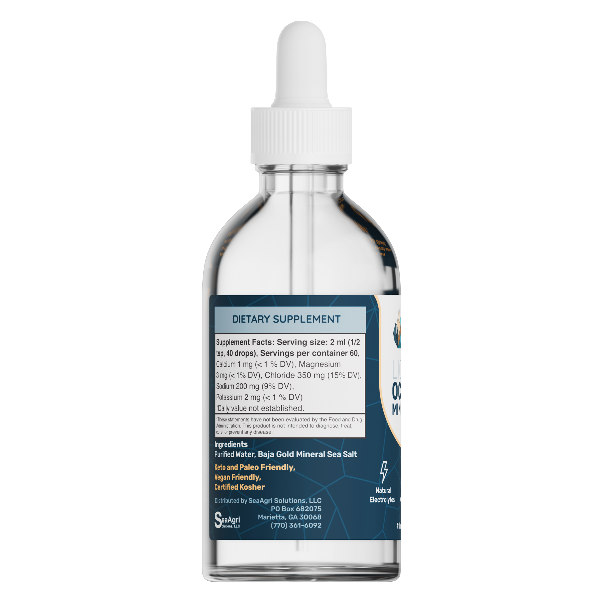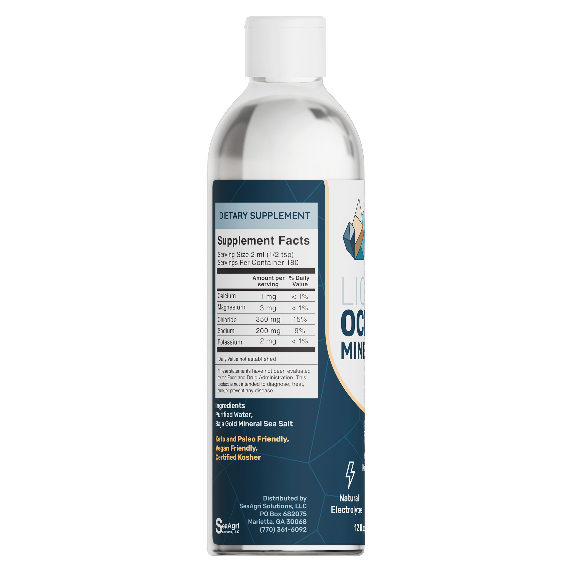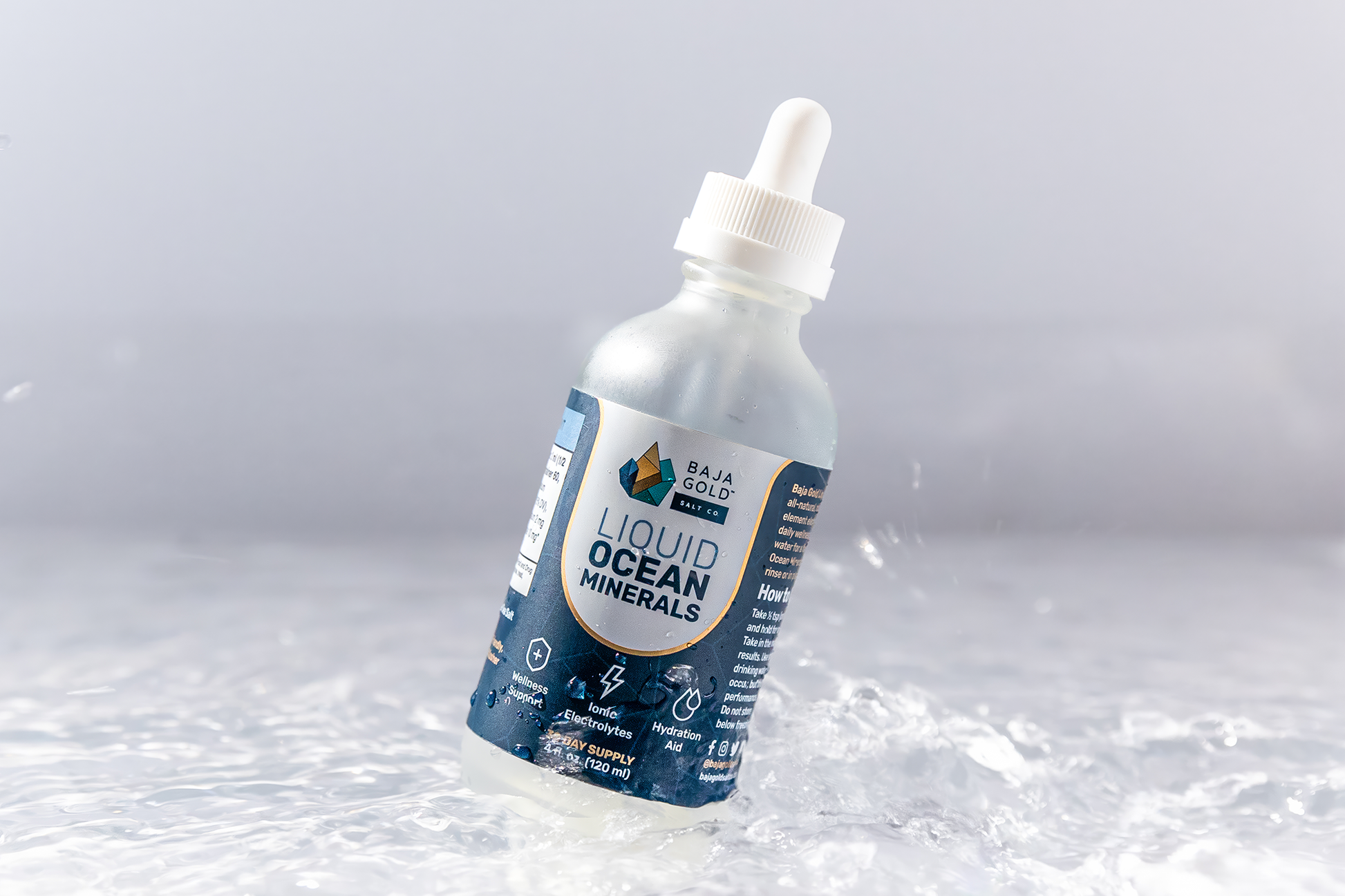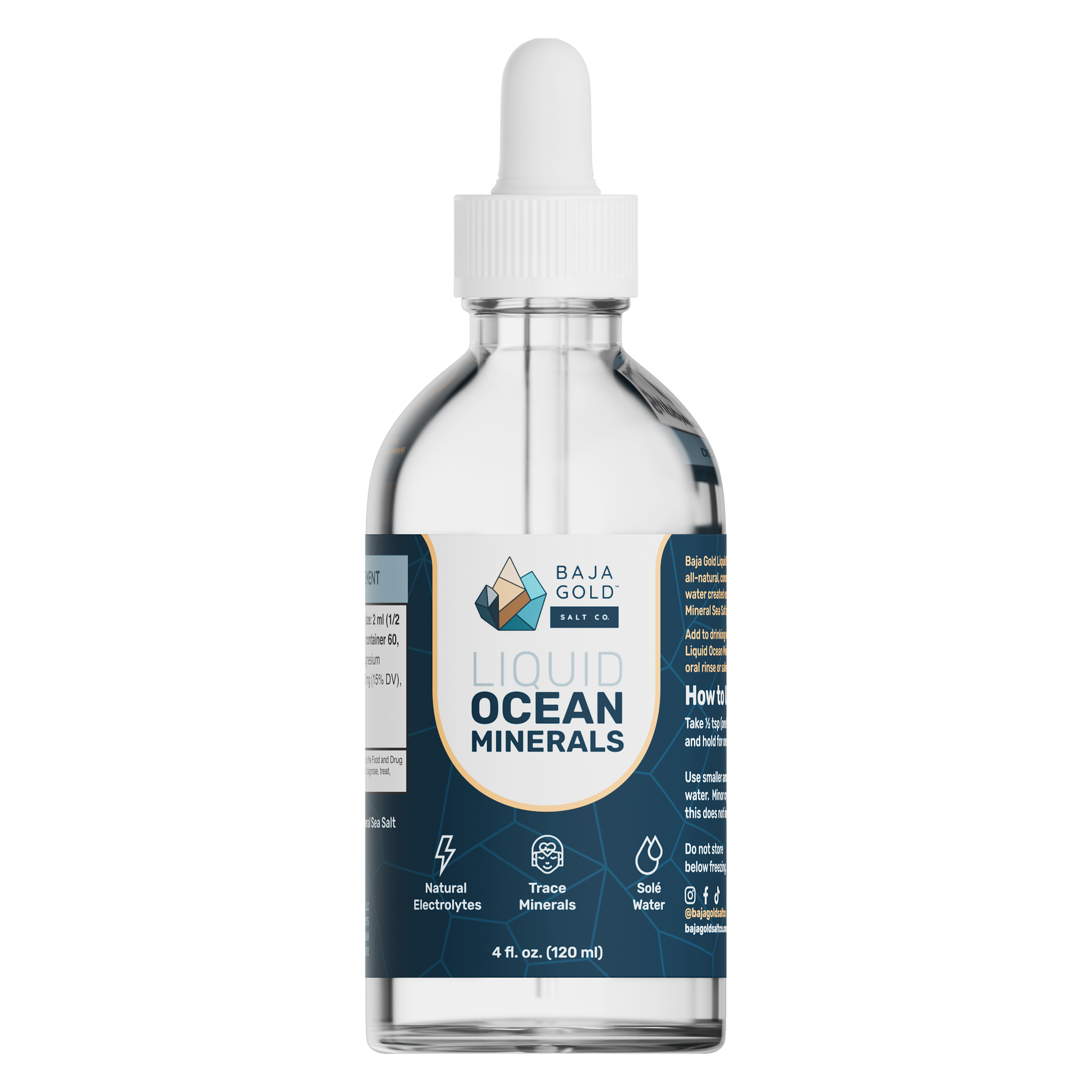 Baja Gold Liquid Ocean Minerals are an all-natural, concentrated trace mineral solé water created exclusively from Baja Gold Mineral Sea Salt and purified water.  Add to drinking water for flavorful hydration support.  Liquid Ocean Minerals can also be used as an oral rinse or anywhere saline solutions may be helpful.