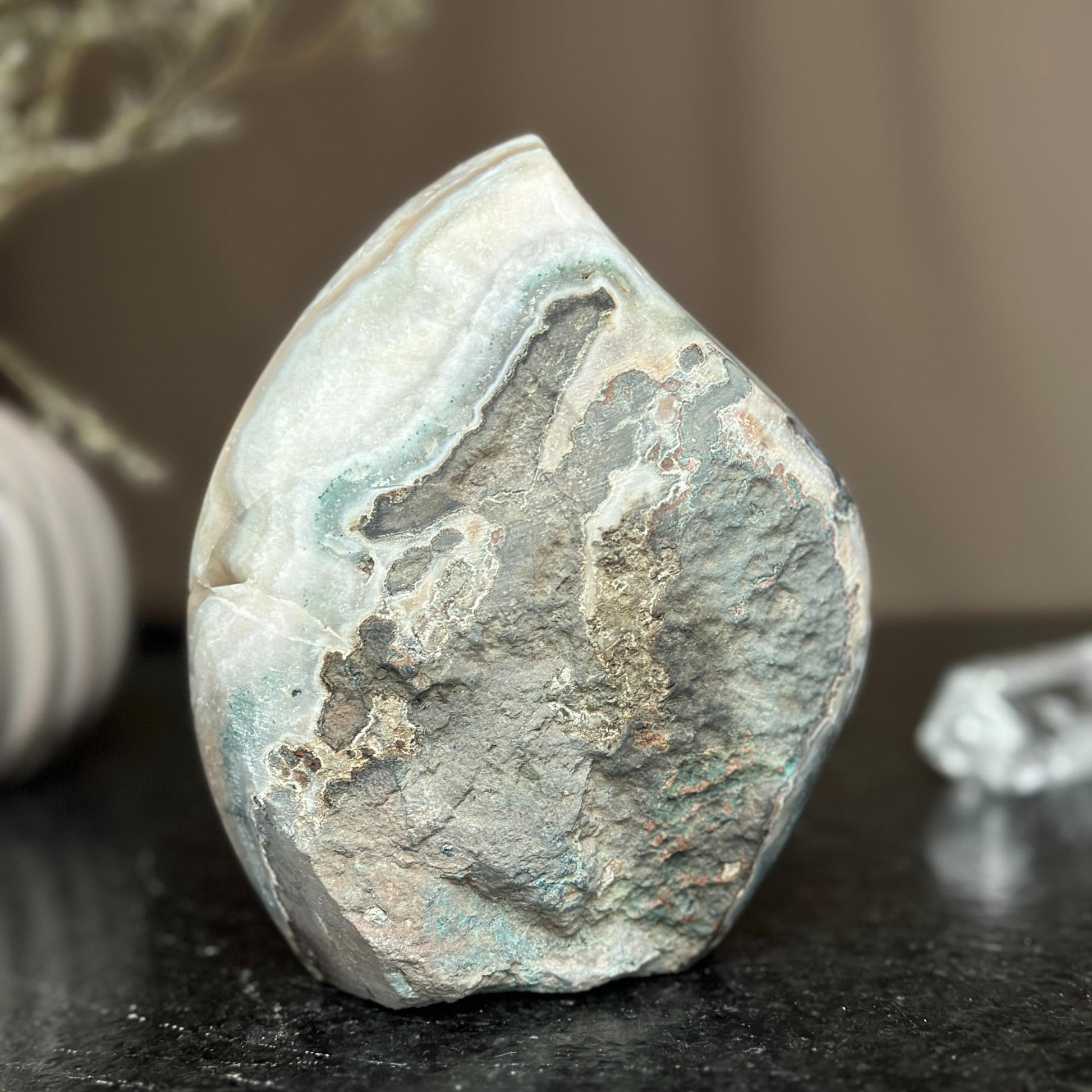 This agate and amethyst flame cluster is perfect for displaying in a reception table or desk.