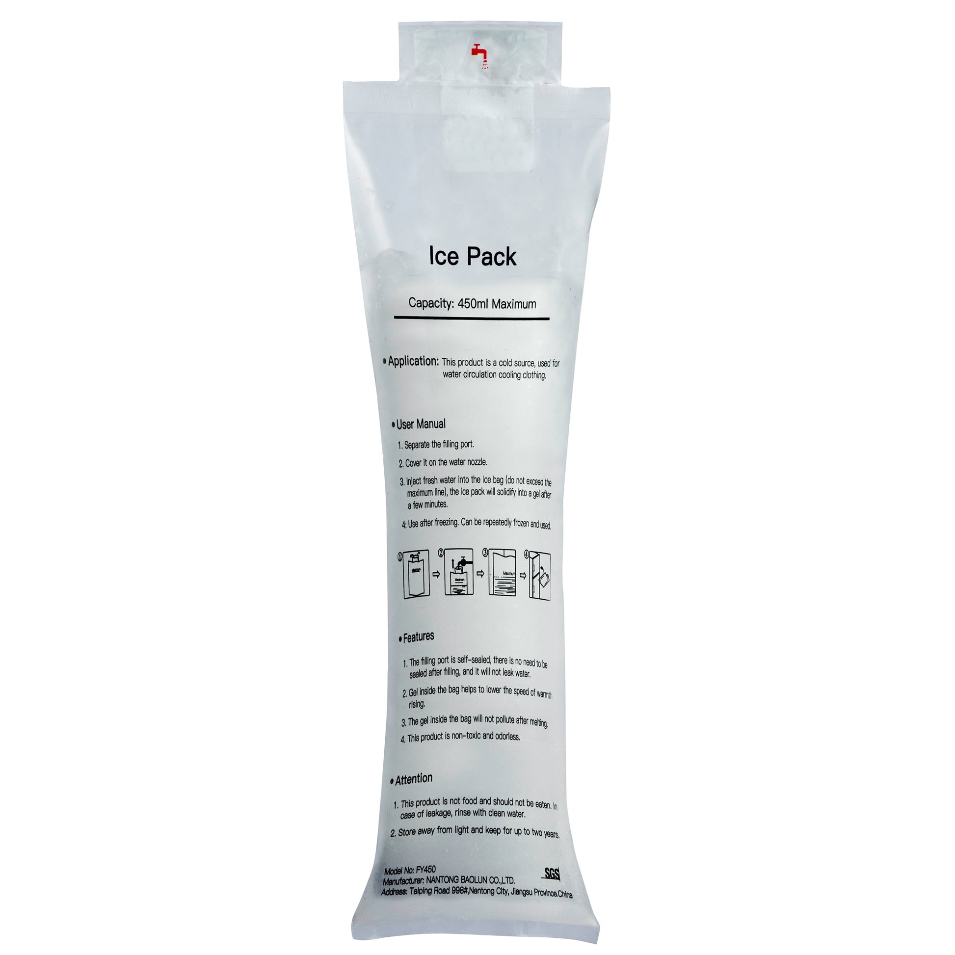 One Ice pack with a special anti-thawing, non-toxic gel is added to the vest reservoir which then gets filled with cool water. This creates a fully enclosed system that routes the water flow around the front and back of the vest along the lines (shown in blue on the product image, but not visible on the actual vest).