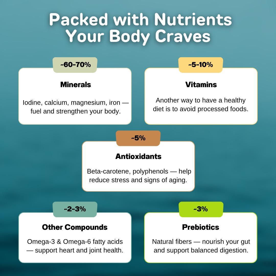 • Sea Moss Power — A nutrient-dense gift from the ocean, known to support skin, digestion, and daily balance through its rich mineral content.
