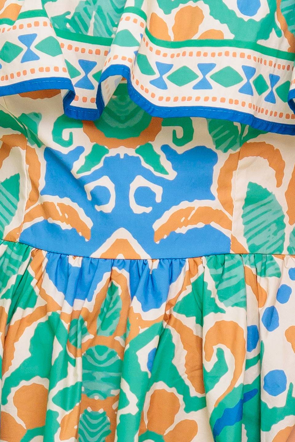 A printed woven mini dress featuring off shoulder neckline, flounce, full skirt and back zipper closure