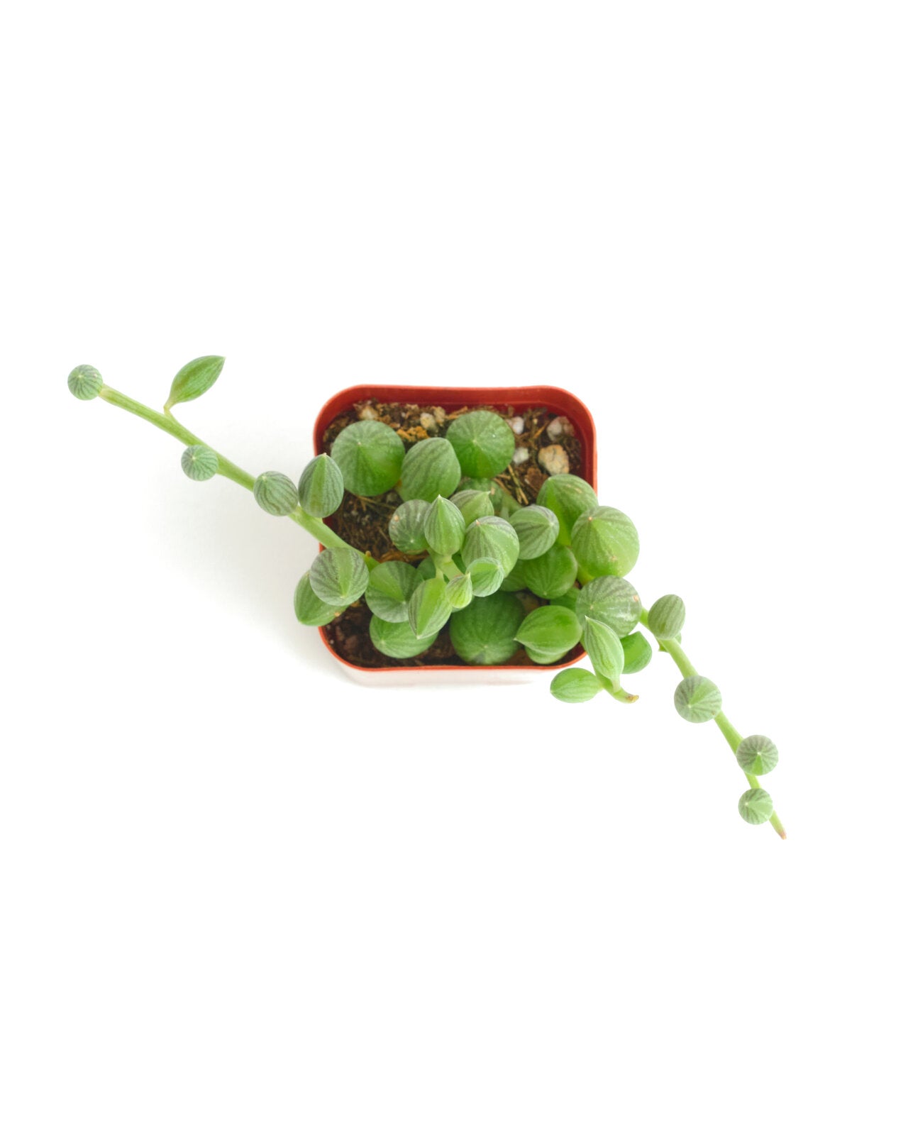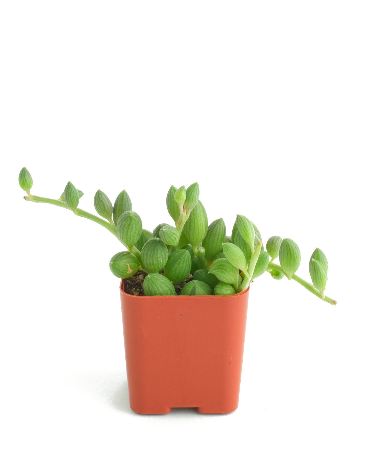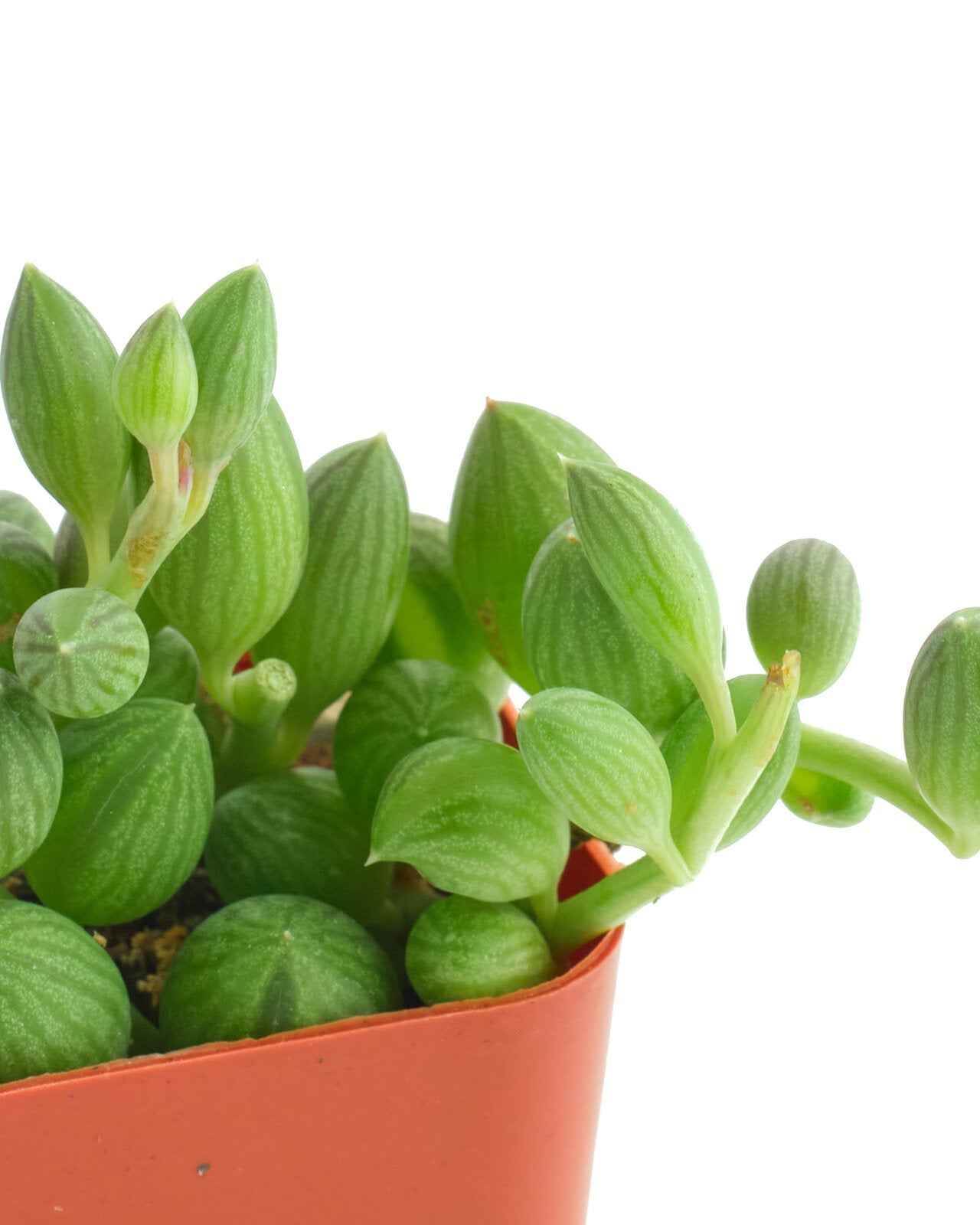 Curio herreanus 'String of Watermelons' is a sought-after succulent prized for its trailing growth and striking resemblance to miniature watermelons. Its dense clusters of bead-like leaves feature green stripes and translucent edges, making it a visually appealing addition to any space. Ideal for hanging containers or elevated positions with bright, indirect light, this plant thrives with moderate watering and well-draining soil. Perfect for succulent enthusiasts looking to add a unique and low-maintenance plant to their collection.