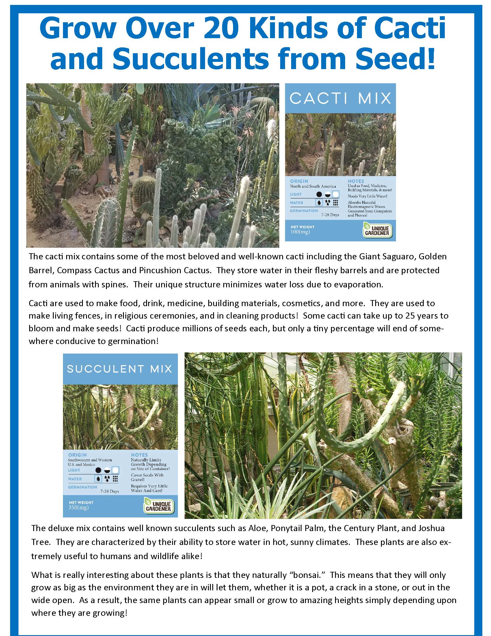 The cacti mix contains some of the most beloved and well-known cacti including the Giant Saguaro, Golden Barrel, Compass Cactus and Pincushion Cactus. They store water in their fleshy barrels and are protected from animals with spines.Their unique structure minimizes water loss due to evaporation.