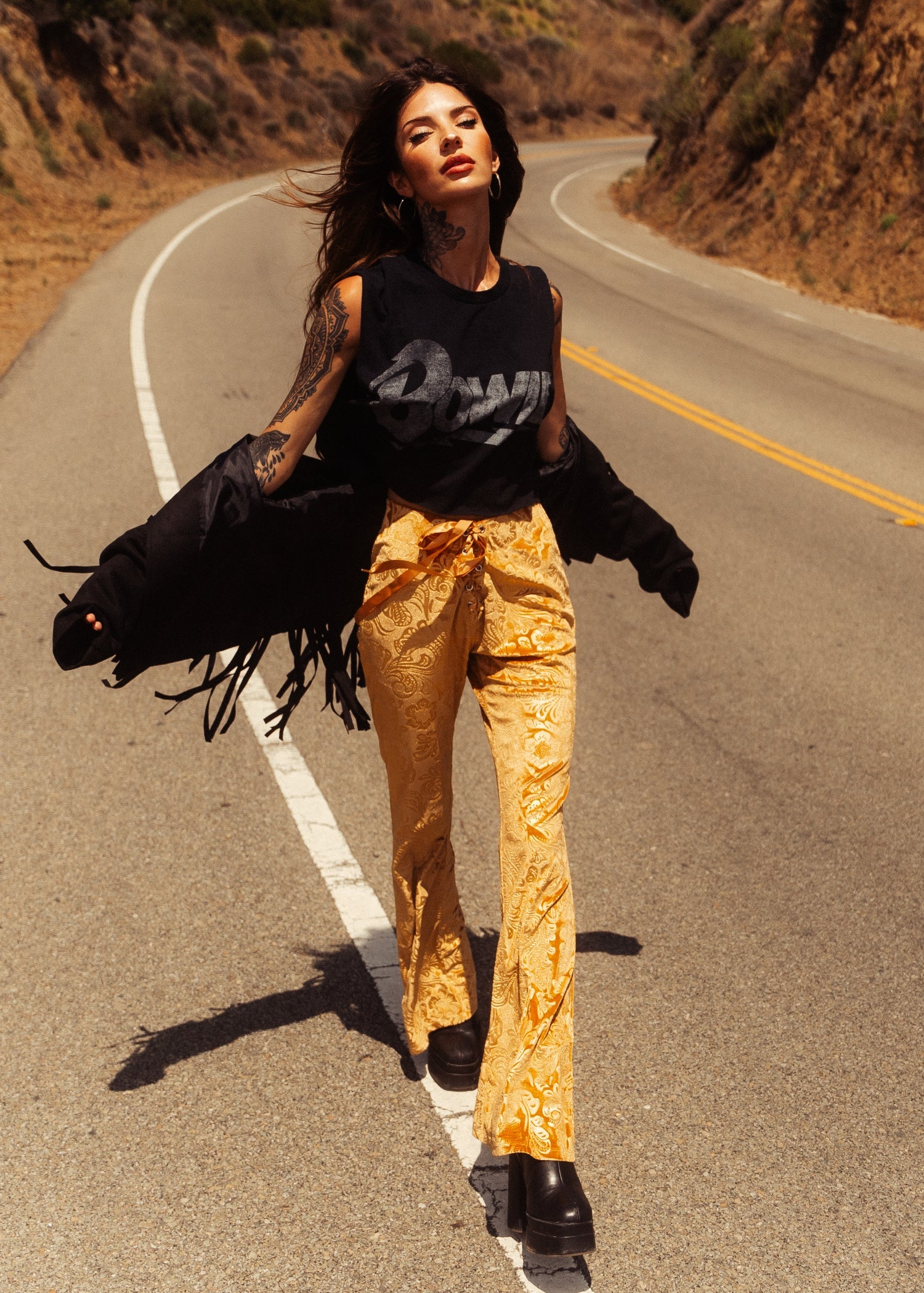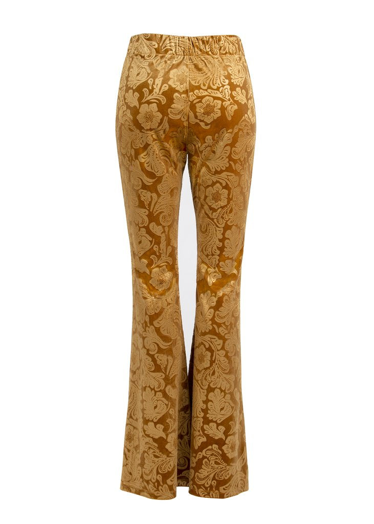 Show off those legs in these essential, retro-chic velvet flares that flatter any ensemble. The pants are made out of a lush mustard yellow velvet fabric that has a beautiful subtle paisley boho inspired burnout pattern. The stretchy pull-on pants hug your curves through the thighs before flaring into a dramatic, retro-inspired bell shape below the knees. Pull-on elastic waistband with stunning matching yellow satin lace up details.
