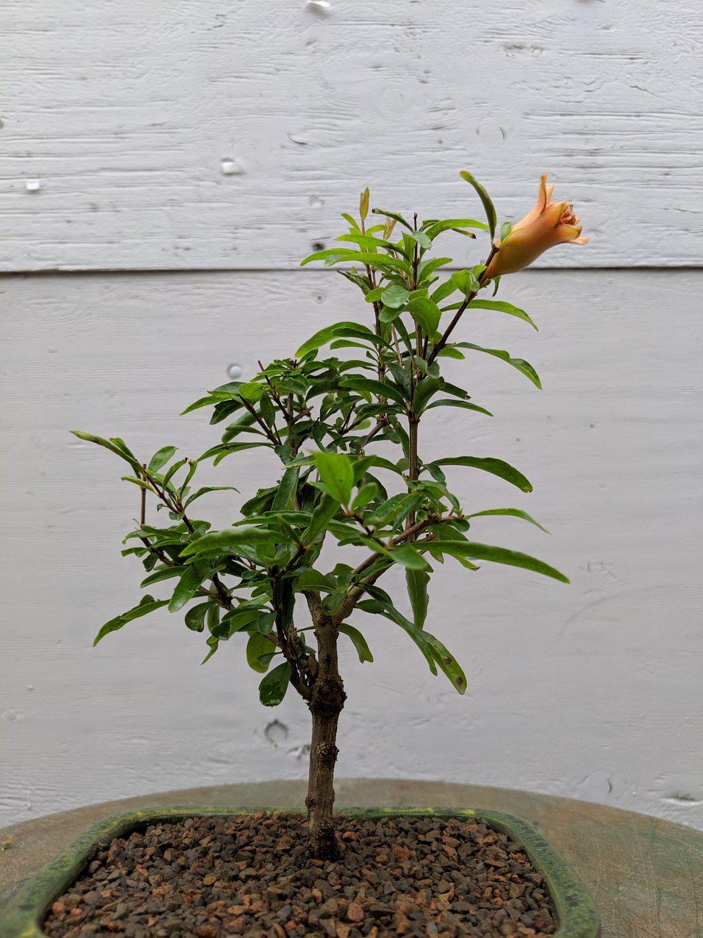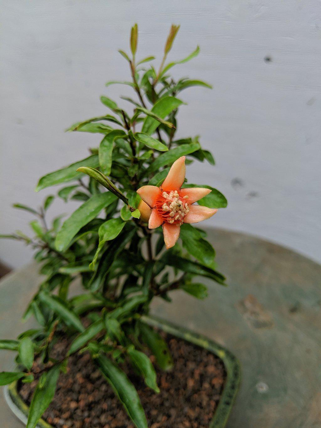 The dwarf pomegranate is a sub-tropical tree native to Asia that's grown for its brilliant orange-red trumpet-like flowers.
