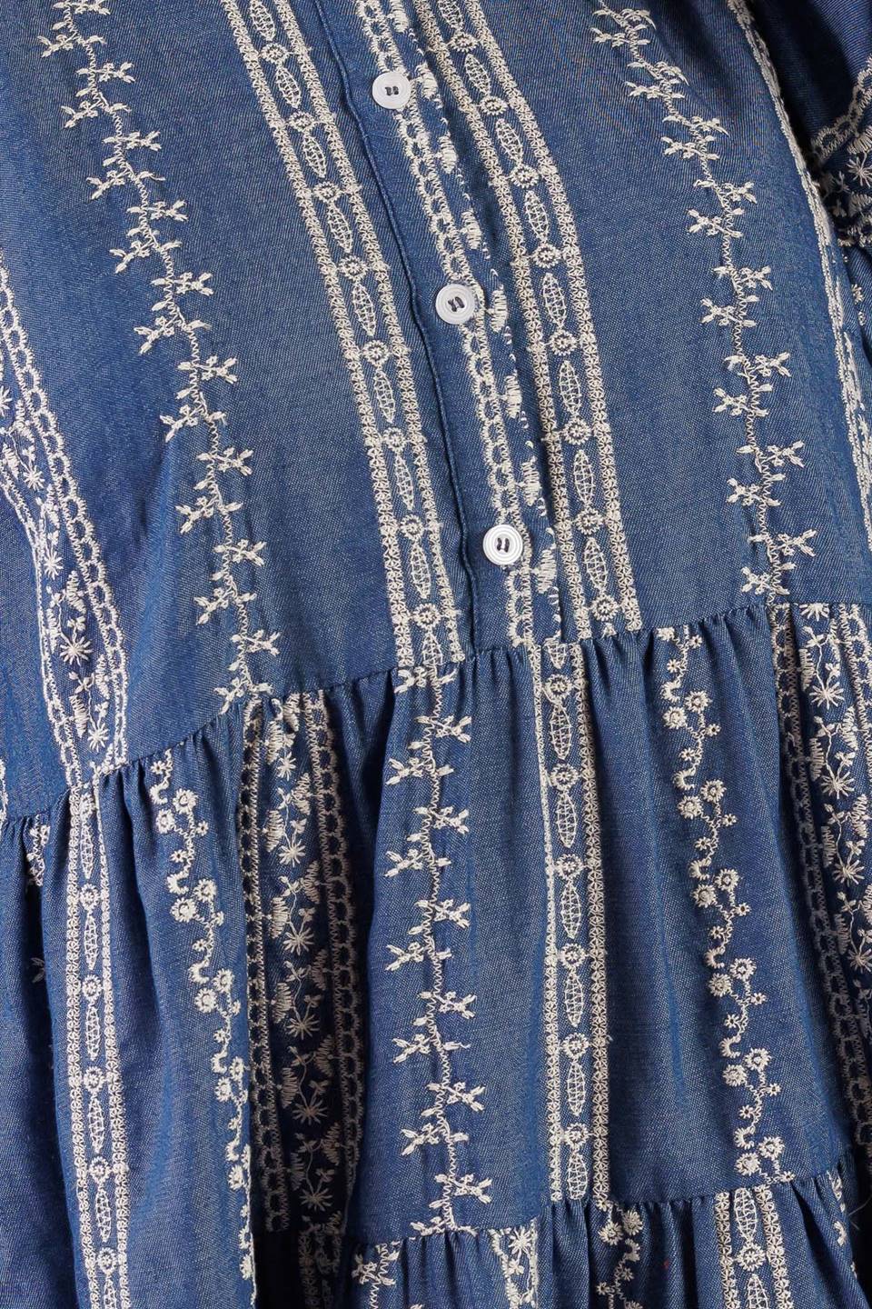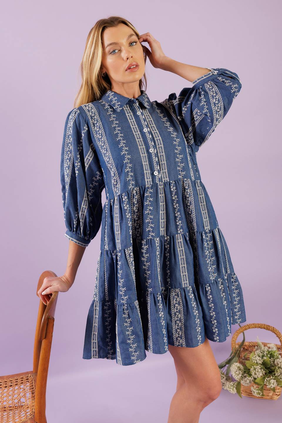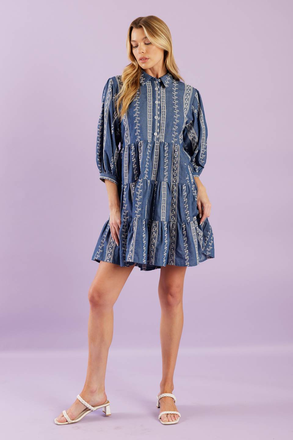 A woven embroidered fabric mini dress featuring collar, button down at bodice, 3/4 sleeve and tiered skirt