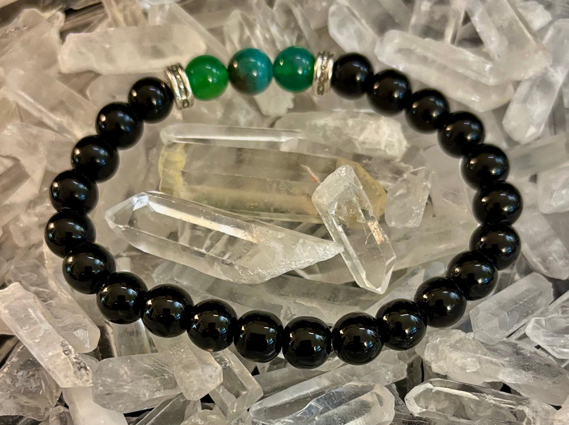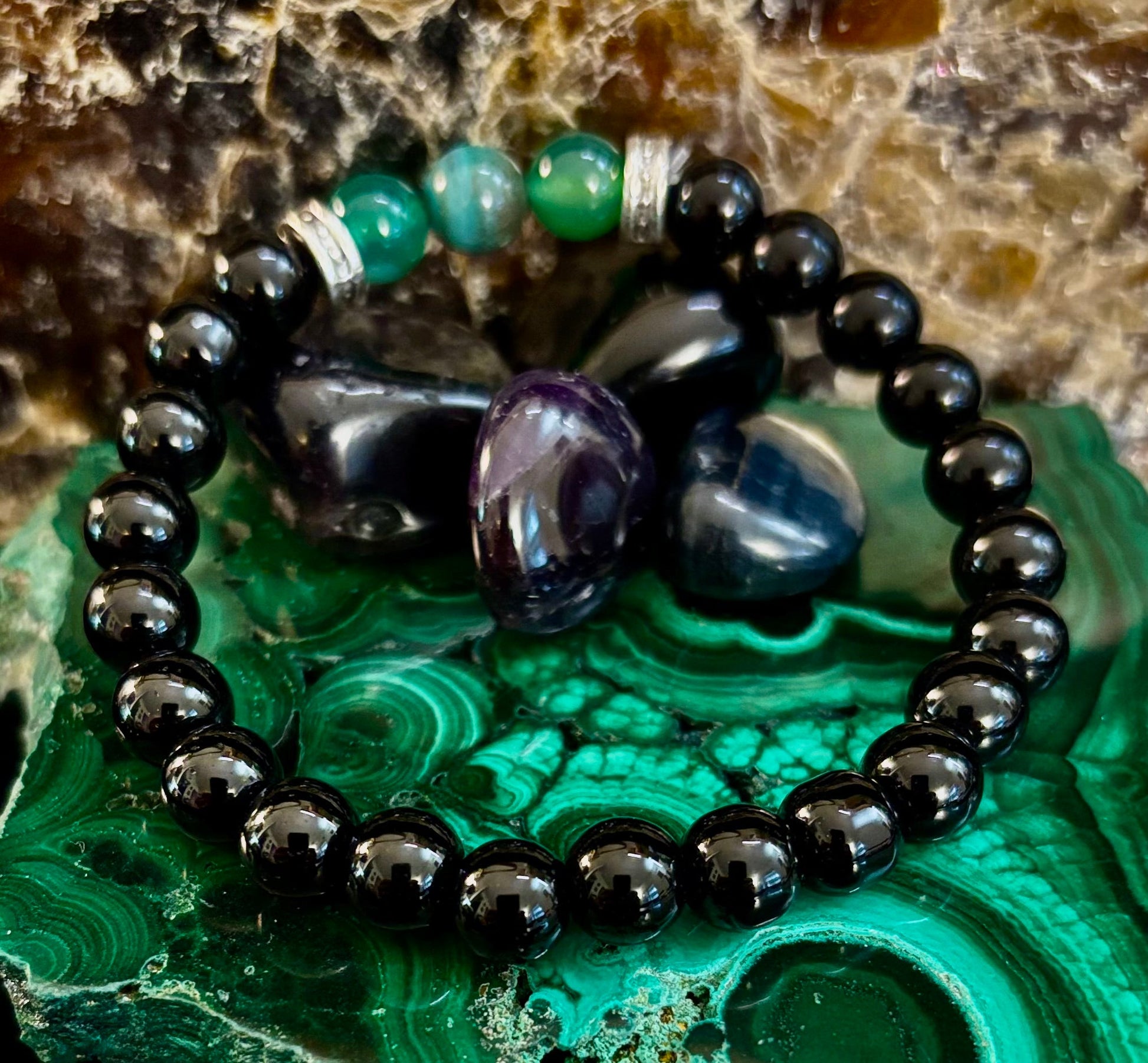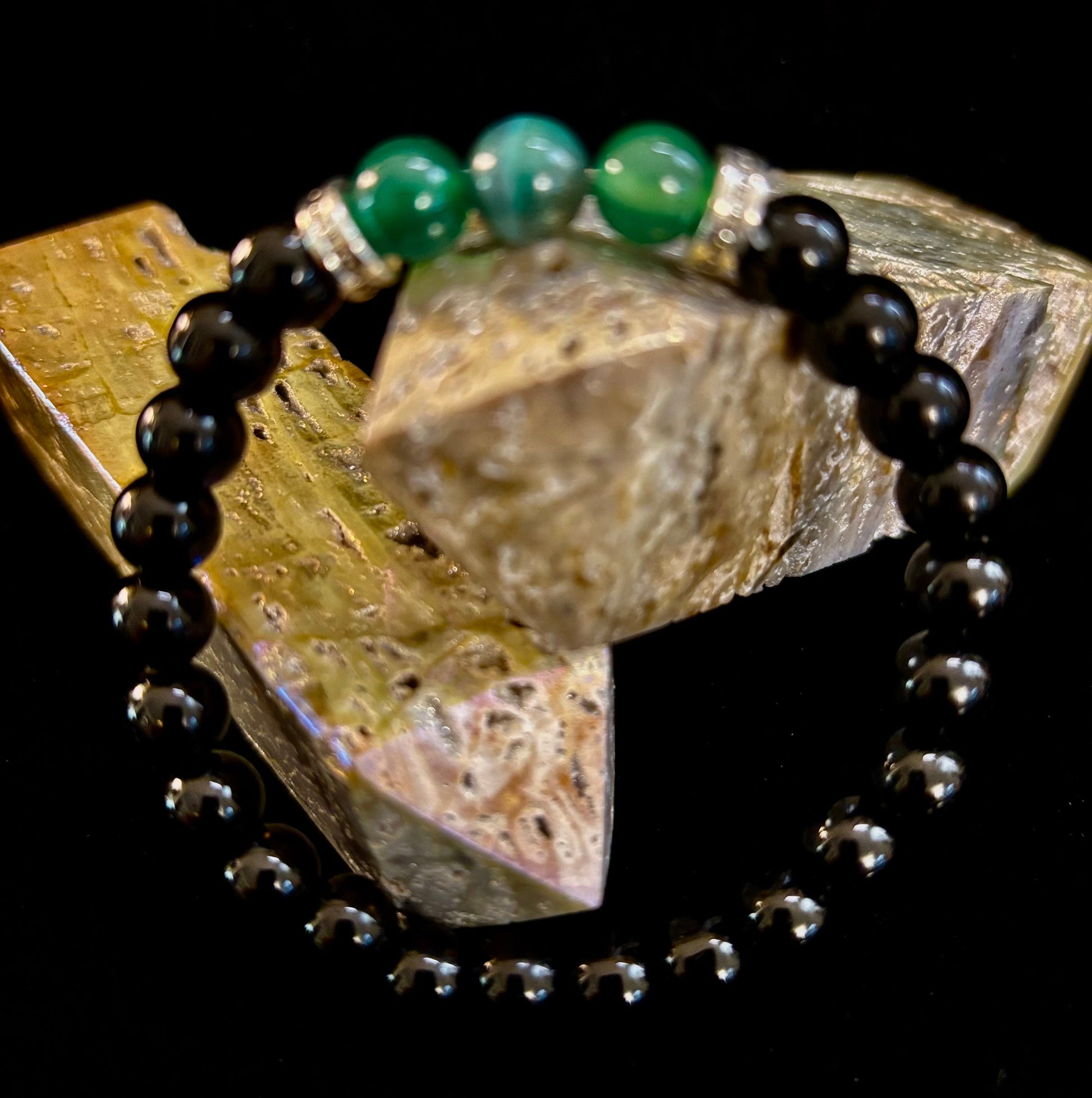 The natural stones are celebrated not only for their striking beauty but also for their calming and balancing properties, helping to promote clarity and inner peace. With a comfortable stretch fit, this bracelet is designed to suit medium wrists (snug on larger wrists), ensuring durability and ease of wear throughout the day.