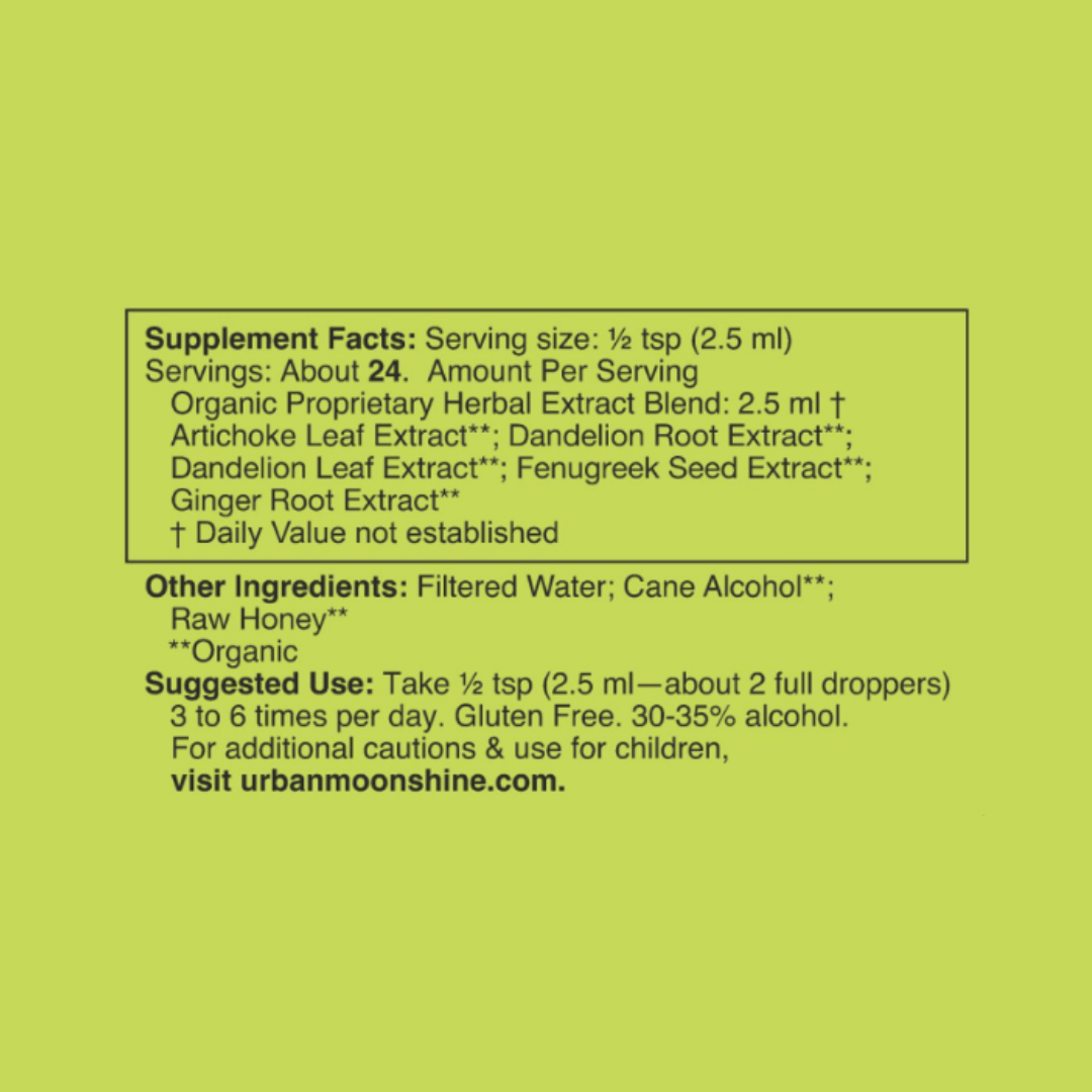 Water; Organic Cane Alcohol; Org. Artichoke Leaf; Org. Dandelion Root; Org. Dandelion Leaf; Org. Fenugreek Seed; Org. Raw Honey; Org. Ginger Root. 30-35% alcohol. Certified Organic & Gluten Free.