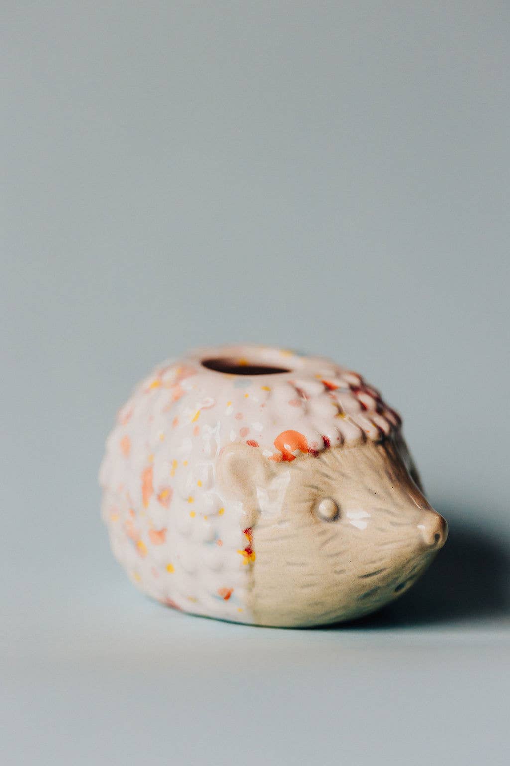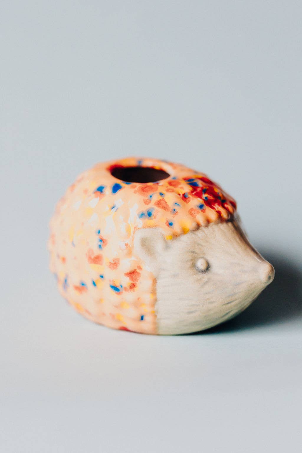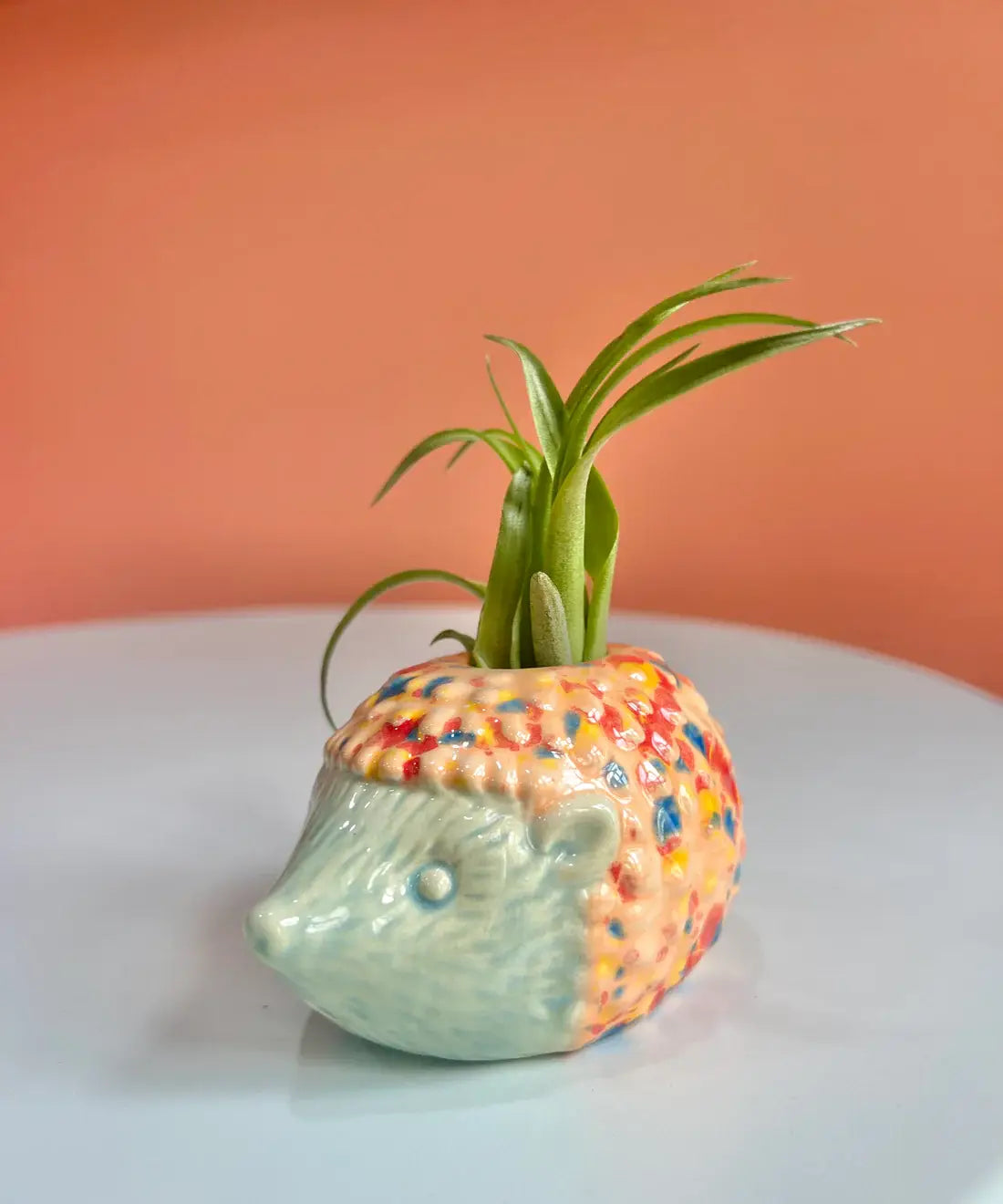 Add a touch of whimsy to your plant collection with this adorable ceramic hedgehog air plant holder. Featuring a pastel blue face and a colorful textured back, this charming little critter is perfect for desktops, windowsills, or as a thoughtful gift. It comes complete with a live air plant (Tillandsia), making it a low-maintenance and cheerful addition to any space.