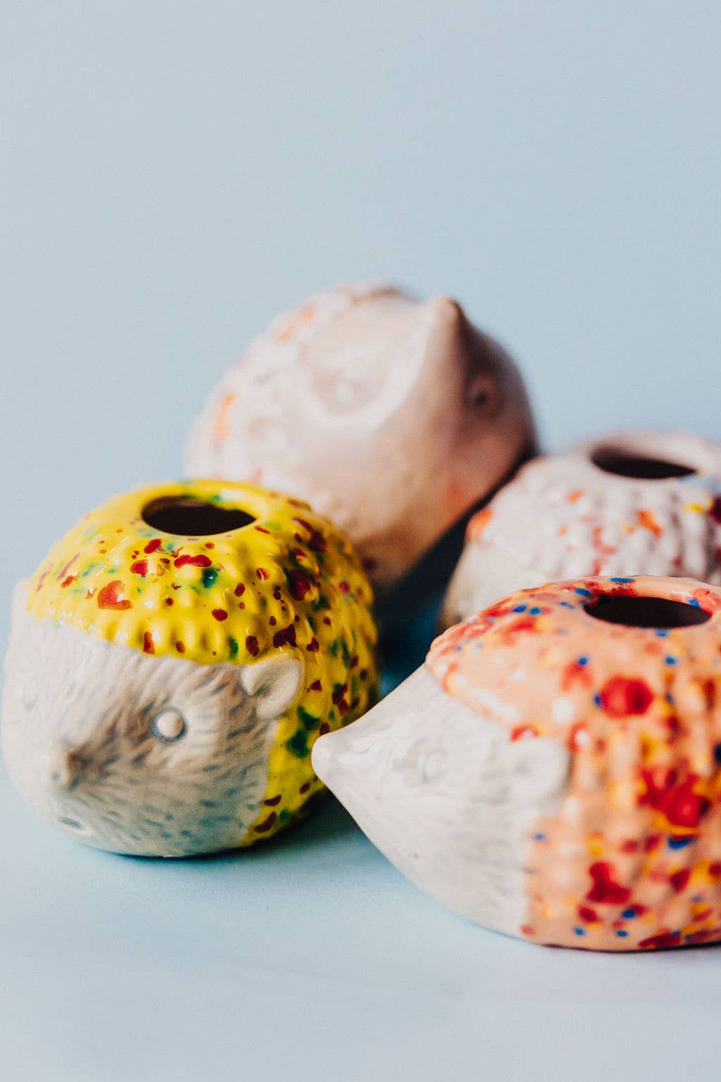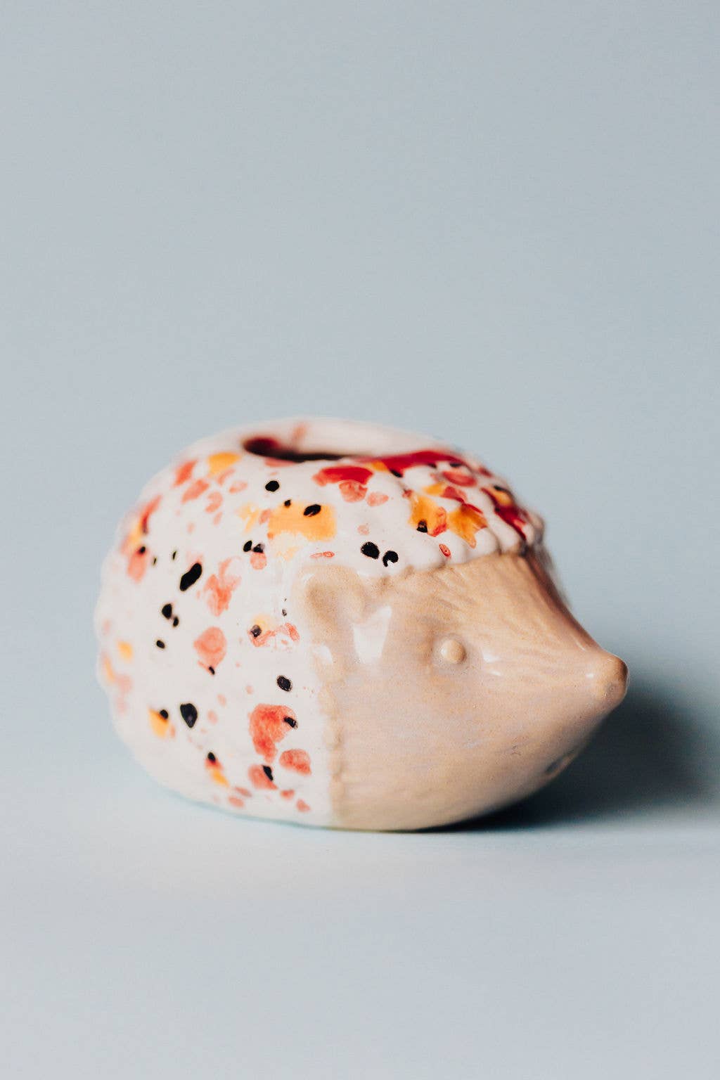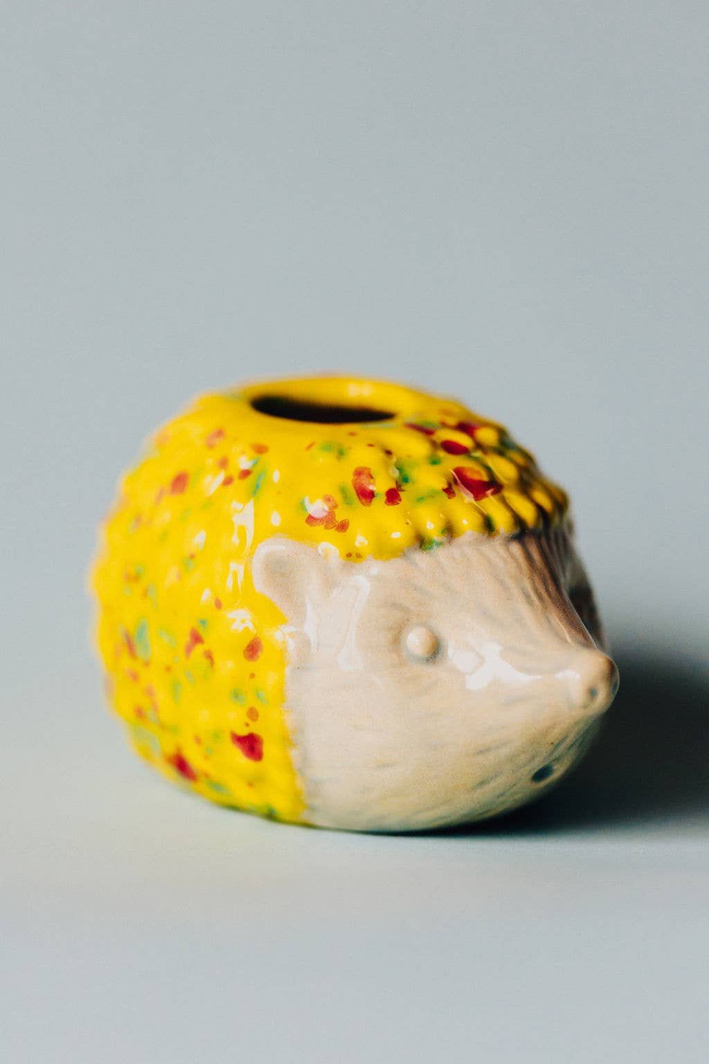 Add a touch of whimsy to your plant collection with this adorable ceramic hedgehog air plant holder. Featuring a pastel blue face and a colorful textured back, this charming little critter is perfect for desktops, windowsills, or as a thoughtful gift. It comes complete with a live air plant (Tillandsia), making it a low-maintenance and cheerful addition to any space.