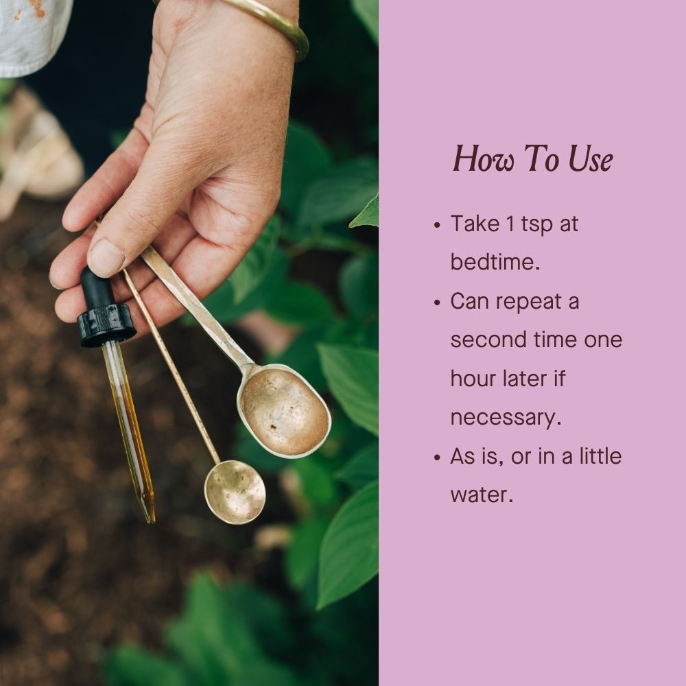 Suggested use: 5 ml (1 tsp). Can repeat a second time one hour later if necessary. Not to be used during pregnancy, breastfeeding, or in children under 18.