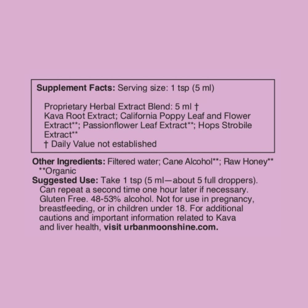 Organic Proprietary Herbal Extract Blend: Kava Root; Organic California Poppy Leaf and Flower; Org. Passionflower Leaf; Org. Hops Flower.