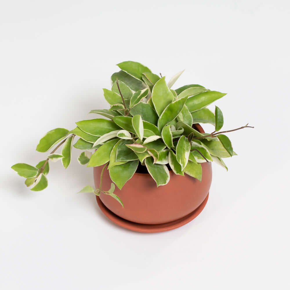 The Hoya carnosa Krimson Queen is a favorite in our pink plant assortment. This is a semi-succulent, perennial, that trails and vines with lush waxy foliage and gorgeous blooms. Needs bright light and drying between watering but will give you amazing growth in hanging pots or elevated shelves. A perfect plant for novice houseplant owners. The Krimson Queen is very similar to the Krimson Princess but with the edges around the outside being white, sometimes known as reverse variegation.