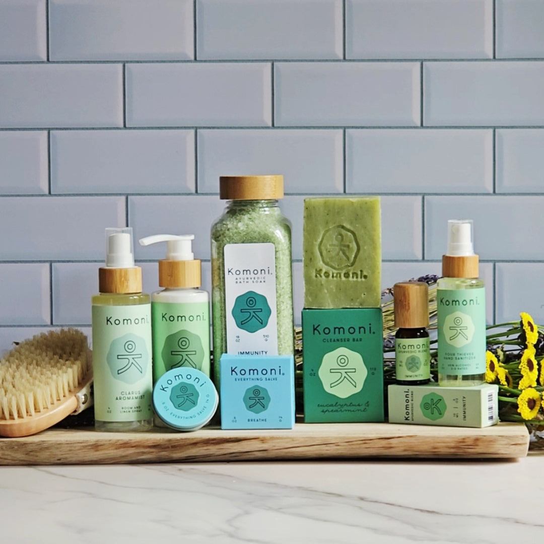 This thoughtfully crafted collection includes IMMUNITY Bath Soak, infused with spinach powder and my powerful ayurvedic essential oil blend to help refresh and rejuvenate after a long day; a separate vial of my pure essential oils IMMUNITY AYURVEDIC Blend 10ml to elevate mood through aromatherapy or by adding to your personal care products;  FOUR THIEVES Hand Sanitizer, a convenient on-the-go spray with a warm, herbal blend to keep hands clean without drying; Eucalyptus Spearmint FACE & BODY CLEANSER BAR, to invigorate skin with an uplifting and refreshing cleanse; RESTORE Botanical Lotion, a deeply hydrating lotion to restore balance and comfort to skin; CLARUS Aromamist - Body, Room & Linen Spray, a light, energizing mist for instant clarity, and BREATHE Everything Salve, a pocket-sized multitasker for nourishing lips, hands, and elbows with ease.
