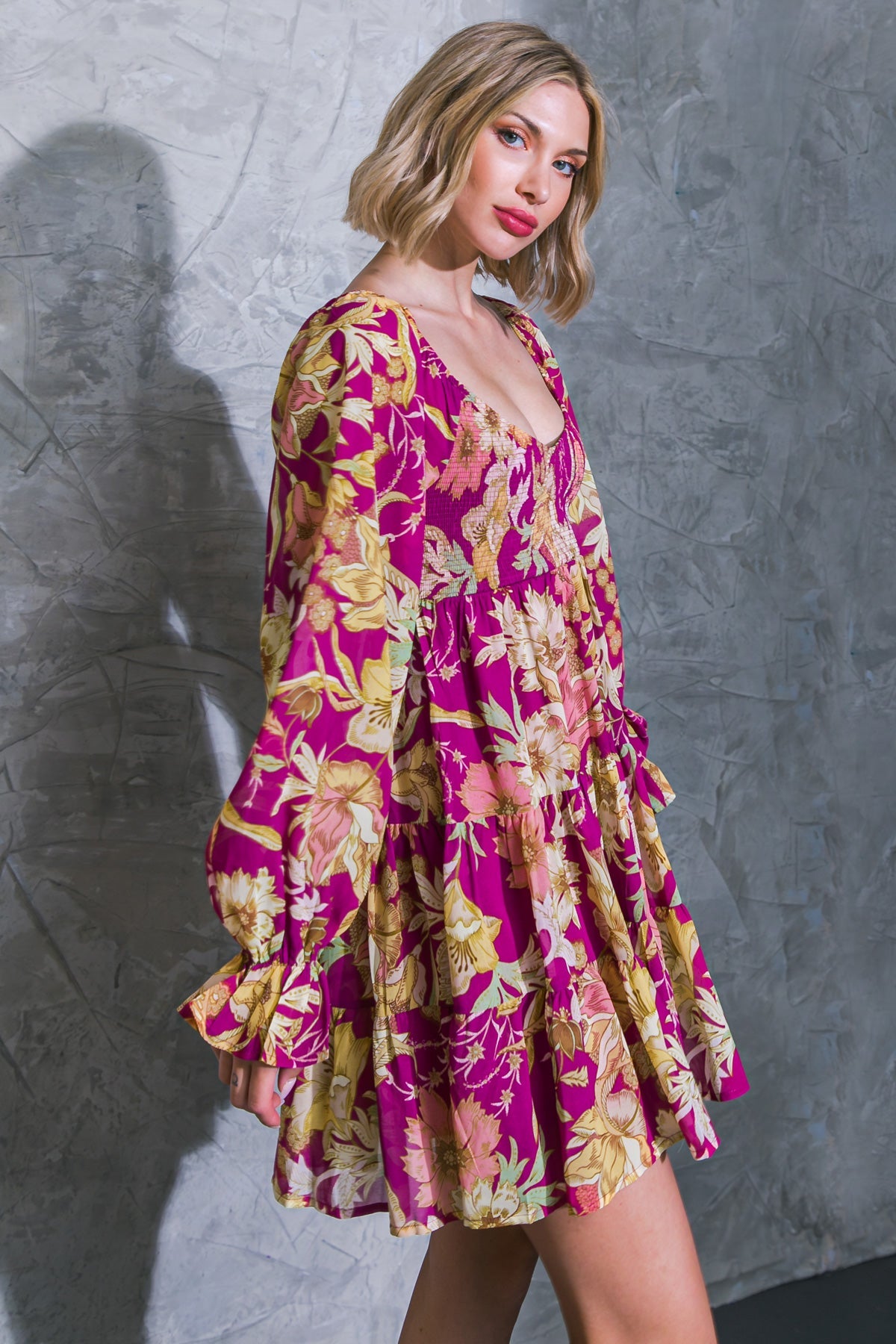 This KEEPER OF MY HEART WOVEN MINI DRESS is the perfect piece for your wardrobe - designed with a charming sweetheart neckline, long sleeves with ruffled edges, and a tiered bottom for unparalleled style and movement. Crafted from lightweight woven fabric, it is the ideal choice for any occasion.