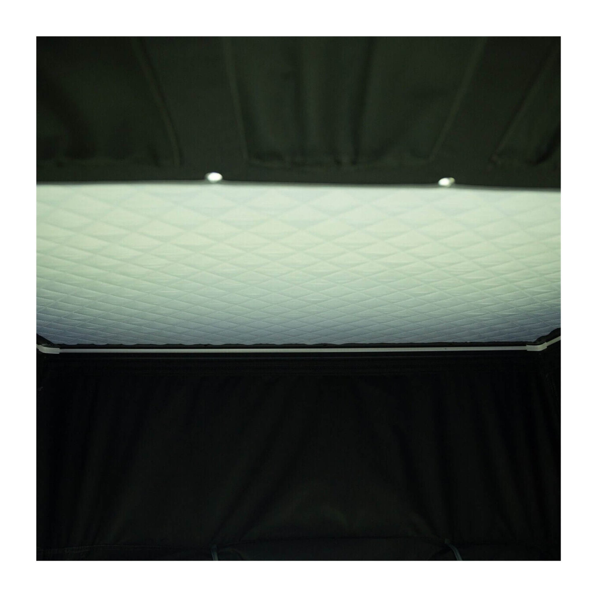 Additionally, the tent has three exterior openings with lockable latches and black ladders. Plus, a fly screen keeps in fresh air while cutting out condensation, keeping it light and breezy inside all through your adventure. And don’t forget the internal storage chest for storing key items such as phones, wallets, or keys plus a waterproof shoe storage bag located just above! And not only that—this tent even comes with LED light strips so you can safely explore in the wee hours of the night.