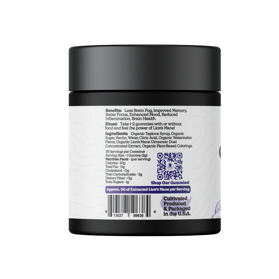 Ingredients: Organic tapioca syrup, organic sugar, pectin, water, citric acid, organic watermelon flavor, organic lion's mane extract, organic plant based colorings.