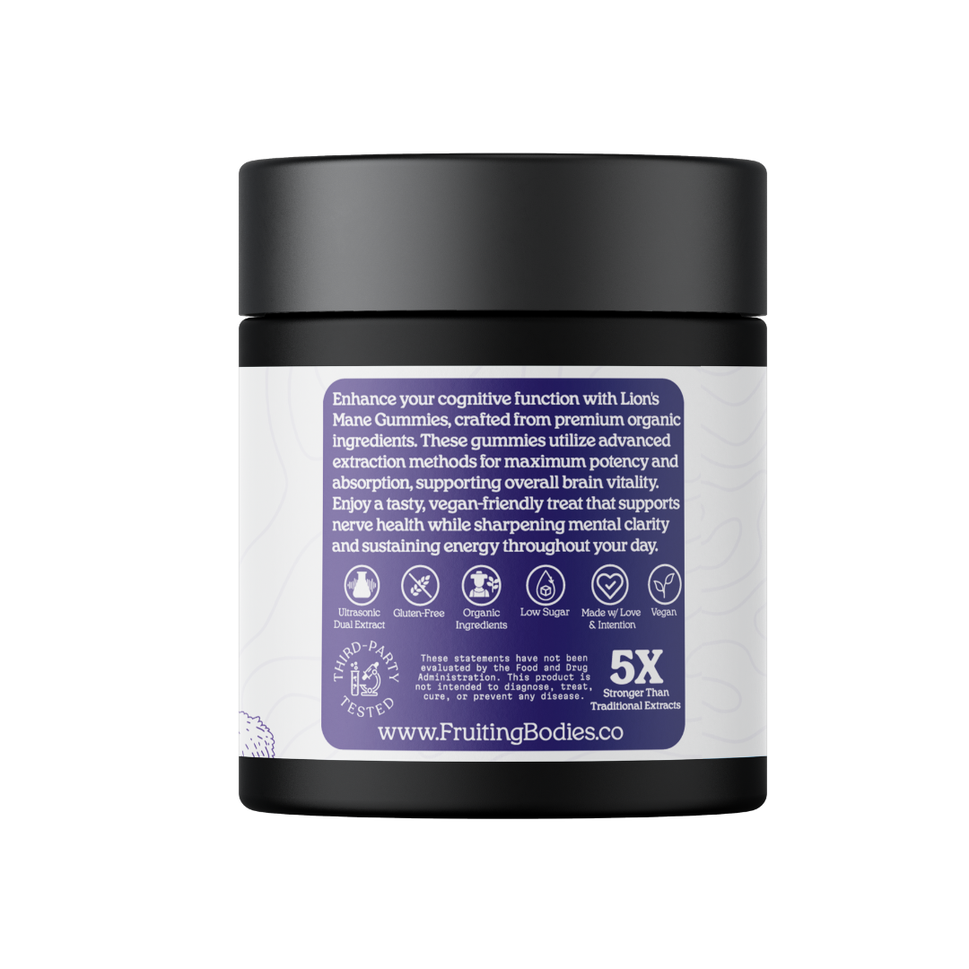 Boost your cognitive health with Lion's Mane Gummies, harnessing the neuro-regenerative properties of these mushrooms. Known for enhancing memory, focus, and overall brain health! Through advanced ultrasonic and dual extraction methods, we ensure potency and maximum bioavailability.