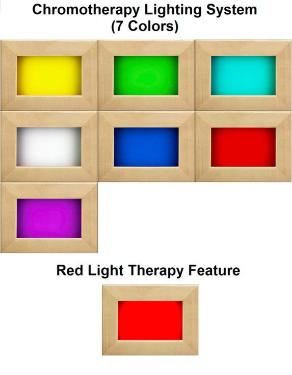 The sleek tempered glass door and dual side windows let in natural light, creating a peaceful, modern escape in your own home. Inside, you'll enjoy the built-in chromotherapy lighting system, which now includes red light therapy starting in 2024 models, enhancing your sessions with light-based wellness benefits.