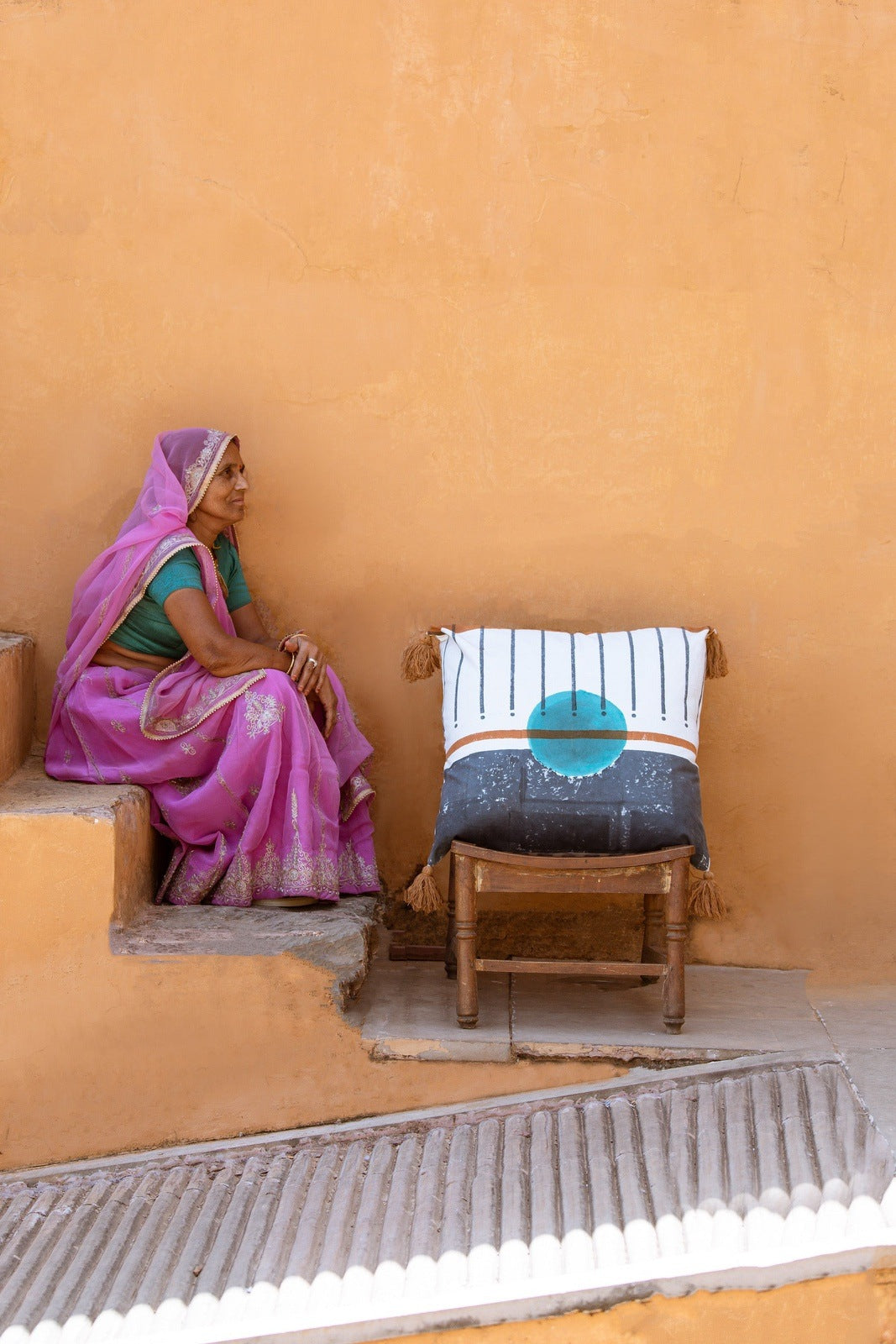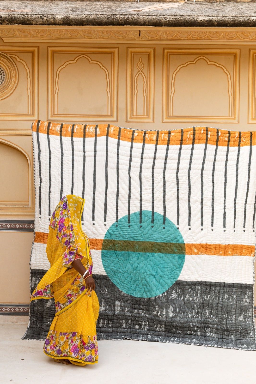 The design is hand-pressed onto each quilt using hand-carved wooden blocks dipped in dyes. The printed cotton shells are brought to the homes of quiltmakers, who stuff and stitch the quilts by hand, creating the final product.