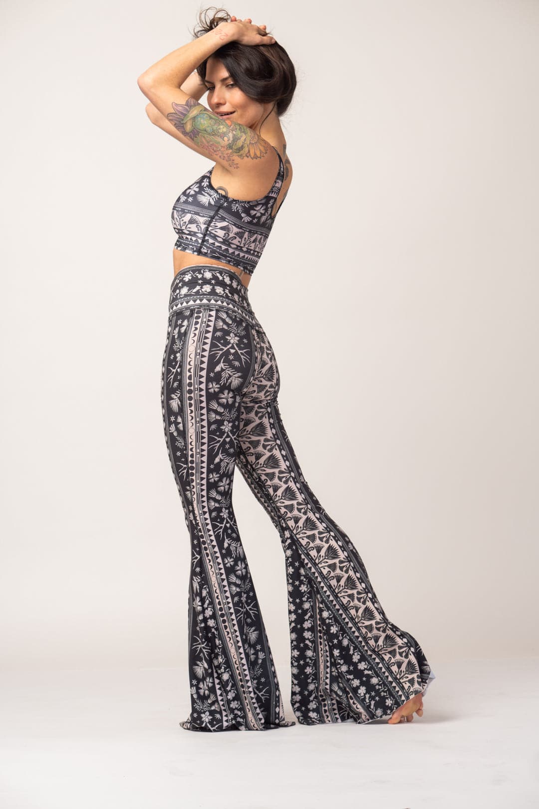 80% Recycled Poly, 12% Spun Poly, and 8% Spandex. Made for supreme comfort, these crop bell bottoms are free from bulk, nylon, and pilling. The fabric offers a soft, low-impact support and flowy drape. Since the fabric is softer and thicker than the Hot Pants the fit can feel a little more relaxed than the skin tight hot pants. Hand Wash, Hang Dry.