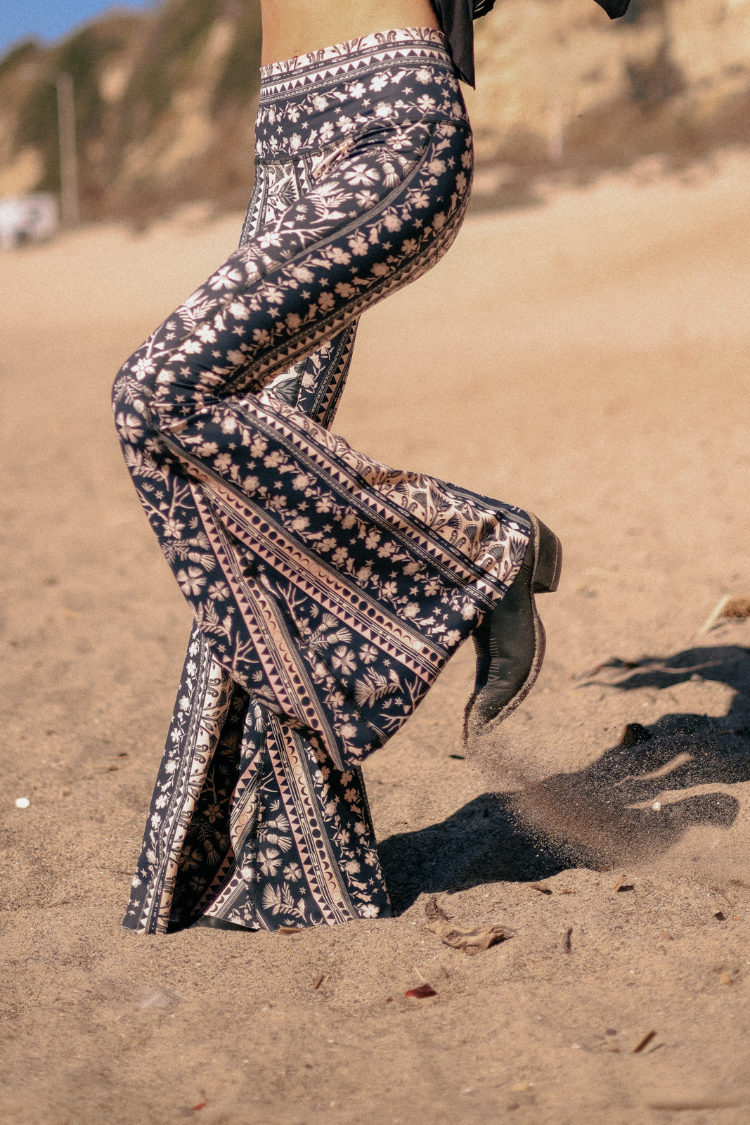 Teeki Bell Bottoms, a timeless essential that combines comfort and funky vintage fashion vibes. Crafted from super-soft brushed jersey, these long flowy bell bottoms are a show stopper for any occasion. Their flattering fit complements all body types, making them a staple for every closet. Dress them up with a heeled boot or wedge to make your legs look extra long.
