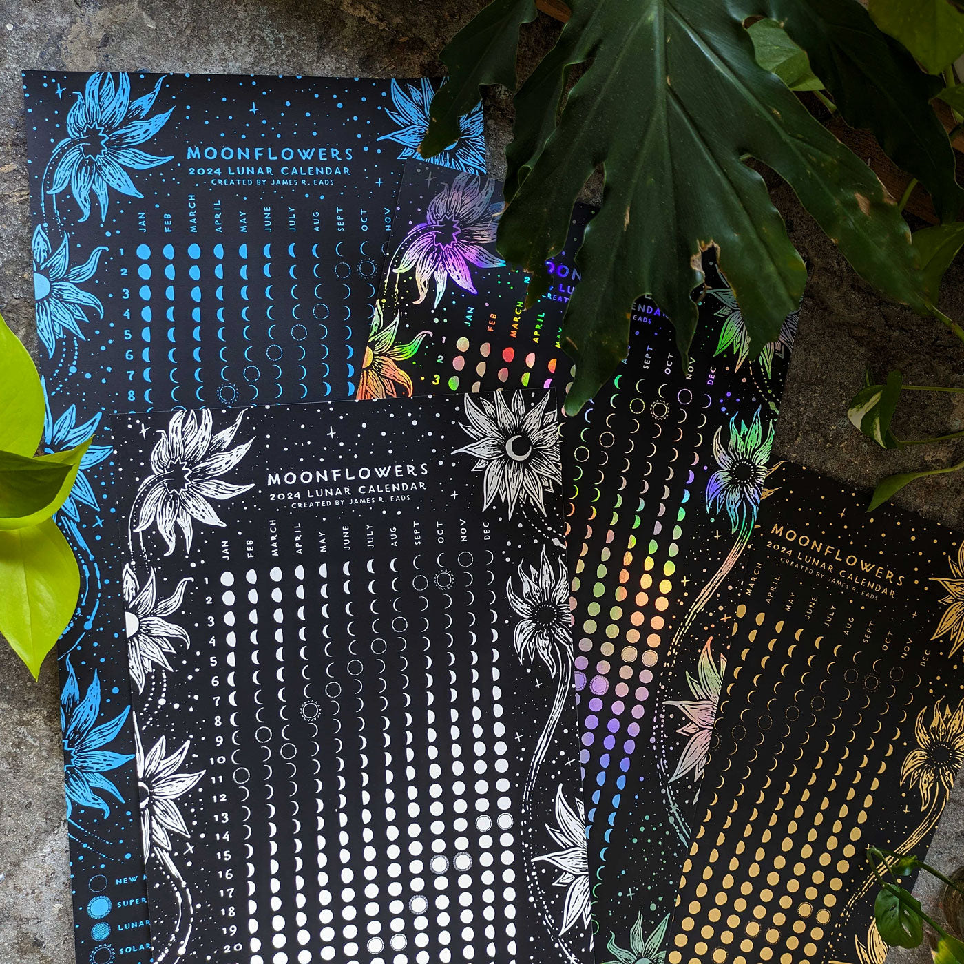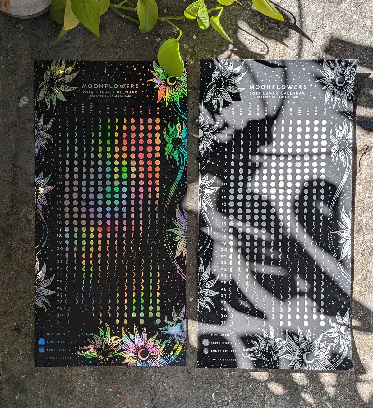 The Moonflowers 2026 Lunar Calendar is a 12" x 24" screenprint on either rainbow foil paper or matte white paper. This calendar includes the lunar phases for the entire year as well as Super Moons, Lunar Eclipses, and Solar Eclipses.