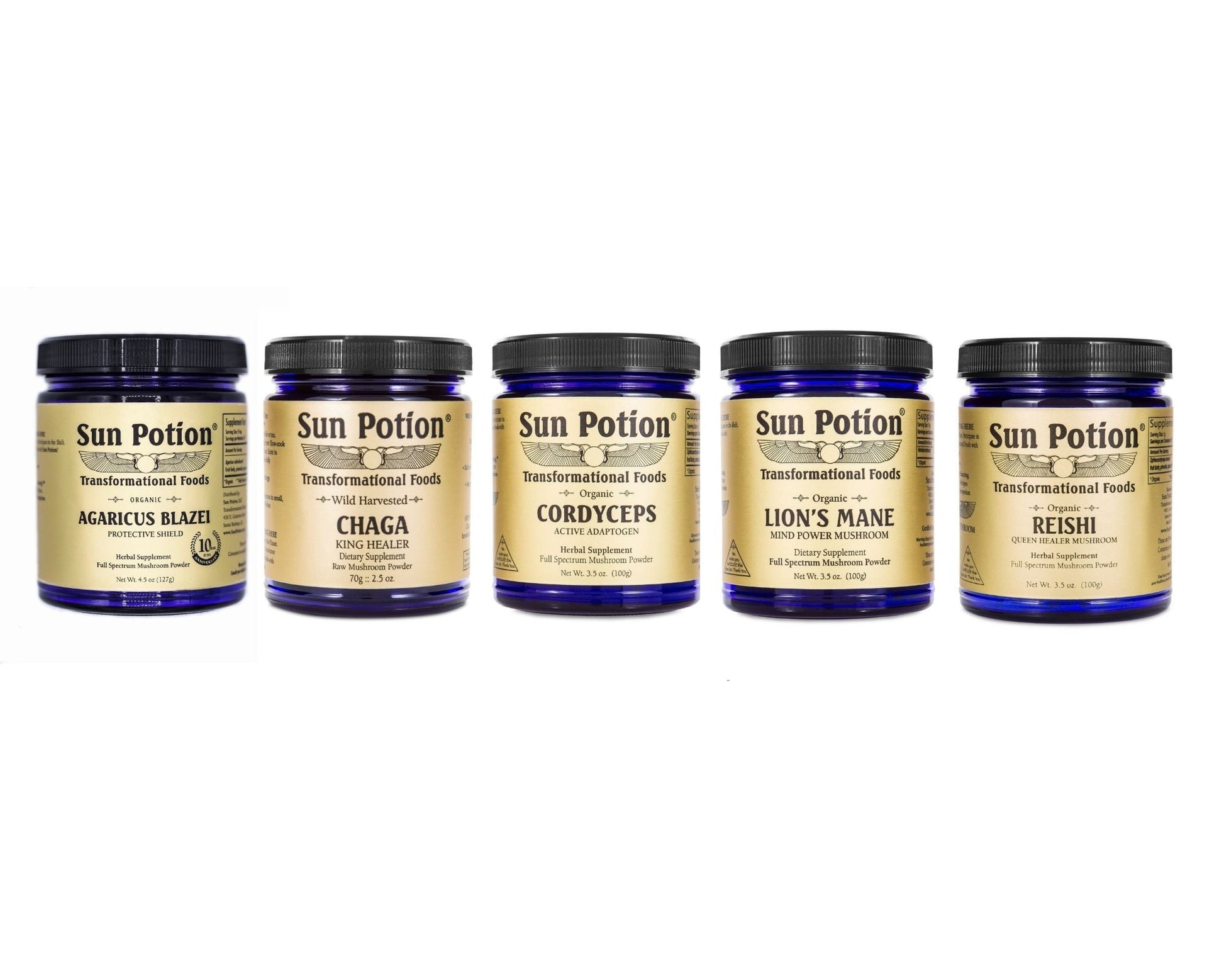This Complete Mushroom Set Includes: Agaricus Blazei, Chaga, Cordyceps, Lion's Mane and Reishi