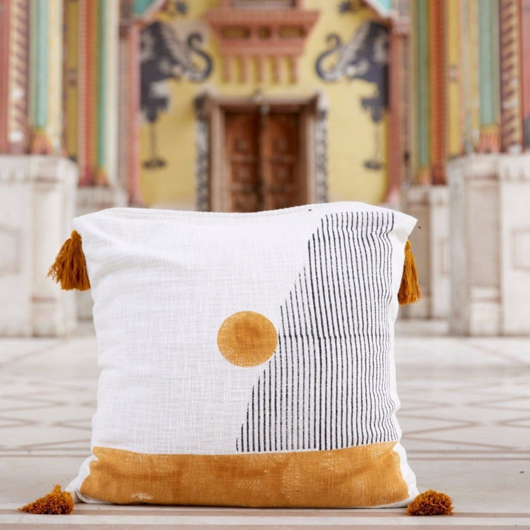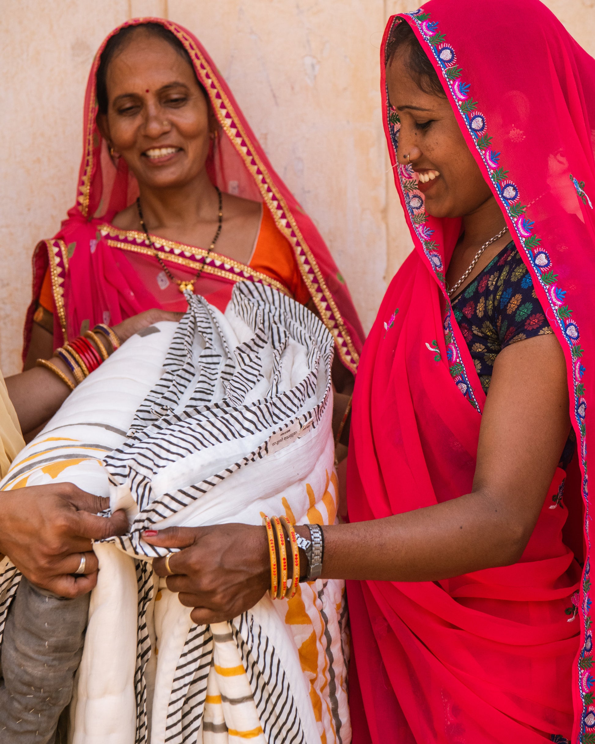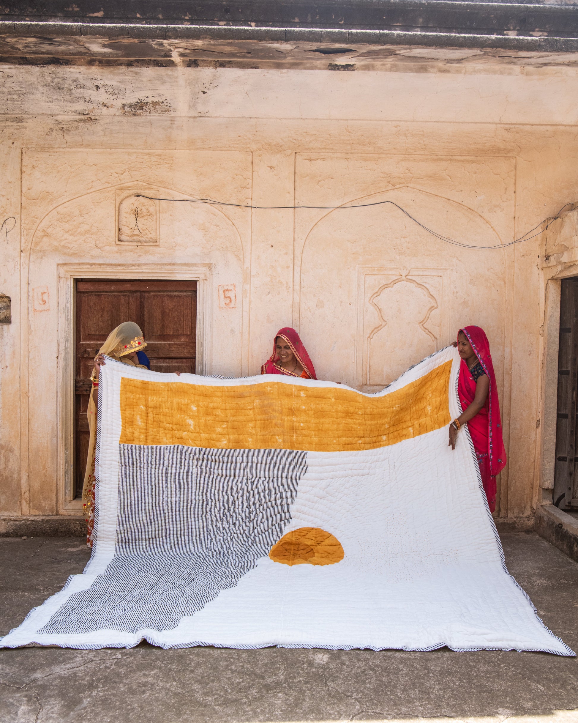 The design is hand-pressed onto each quilt using hand-carved wooden blocks dipped in dyes. The printed cotton shells are brought to the homes of quiltmakers, who stuff and stitch the quilts by hand, creating the final product.