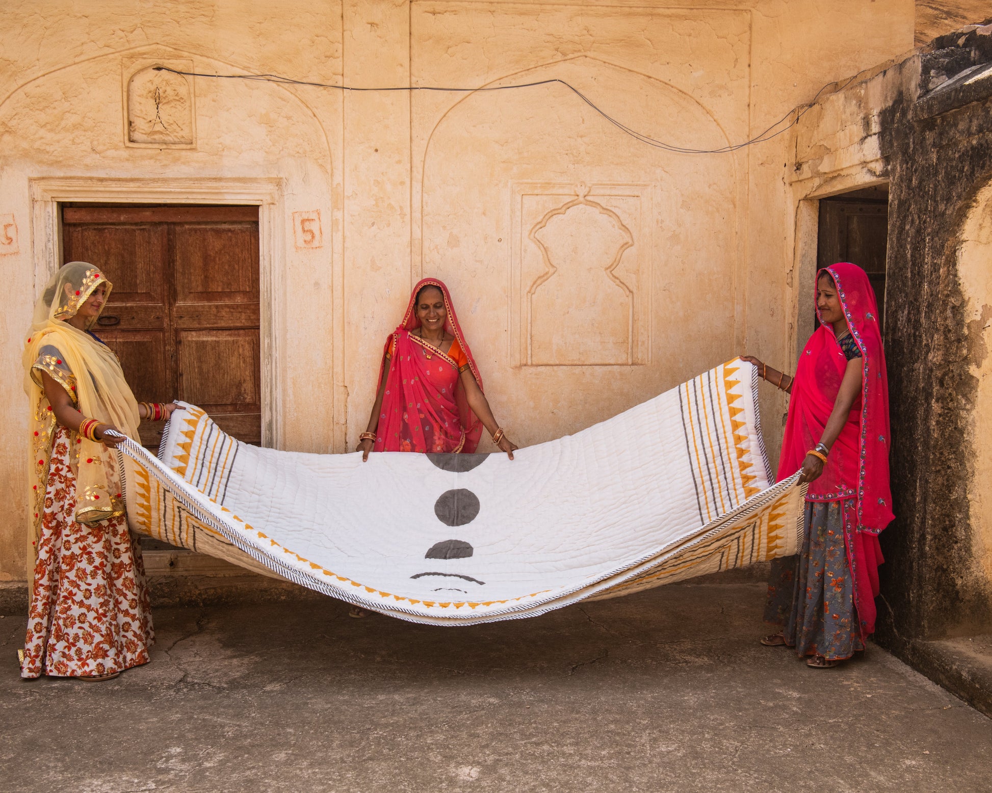 Each quilt is handmade, requiring attention from 4 different artisans, including wood carvers, block printers, quiltmakers, and dye specialists.