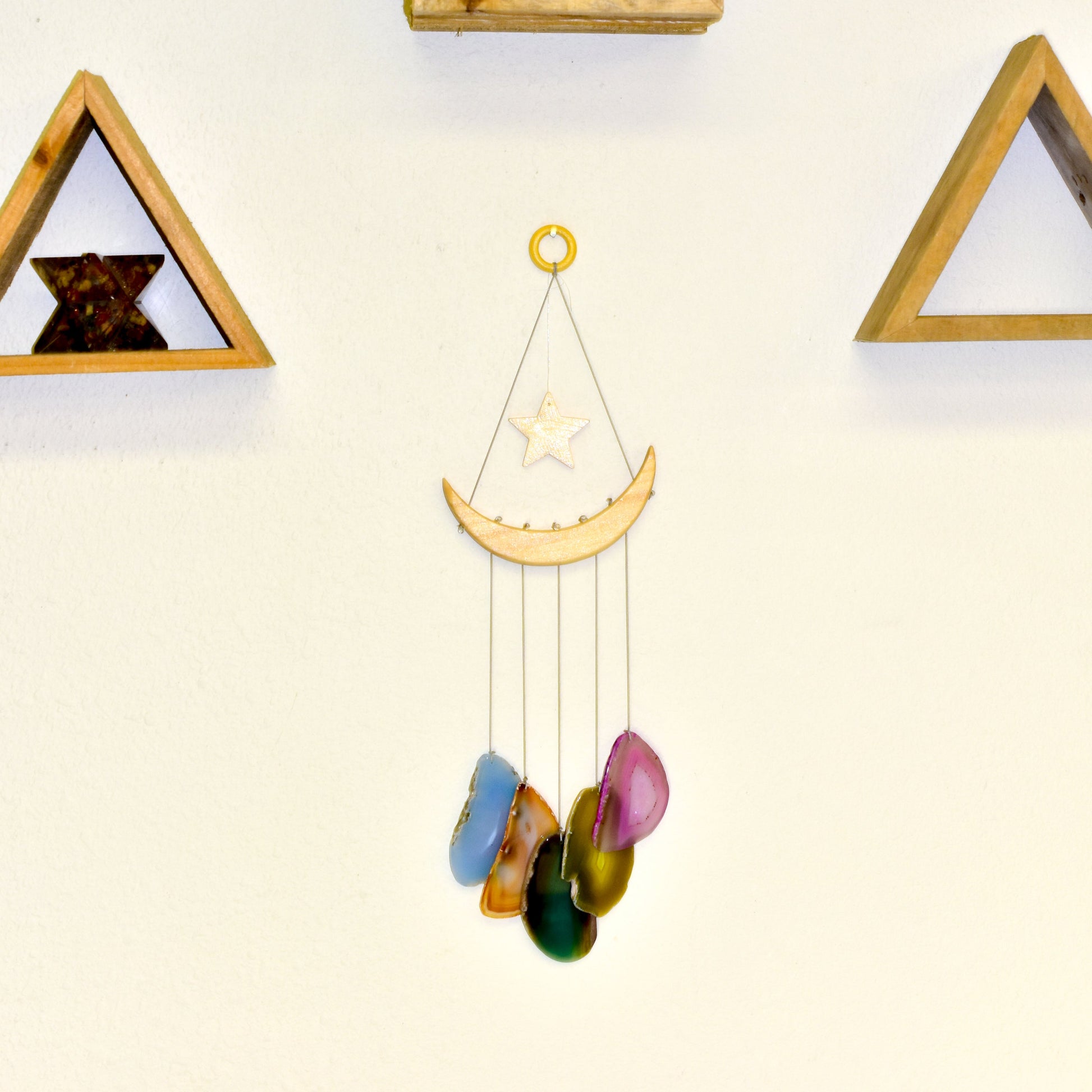 New wind chime made with 5 natural agate slices hanging horizontally from a wood crescent moon and star! This item is perfect for your backyard or front porch, or even hang it on a wall as decoration! The agate slices make a beautiful sound and the wood moon & star give it a cool modern feel.