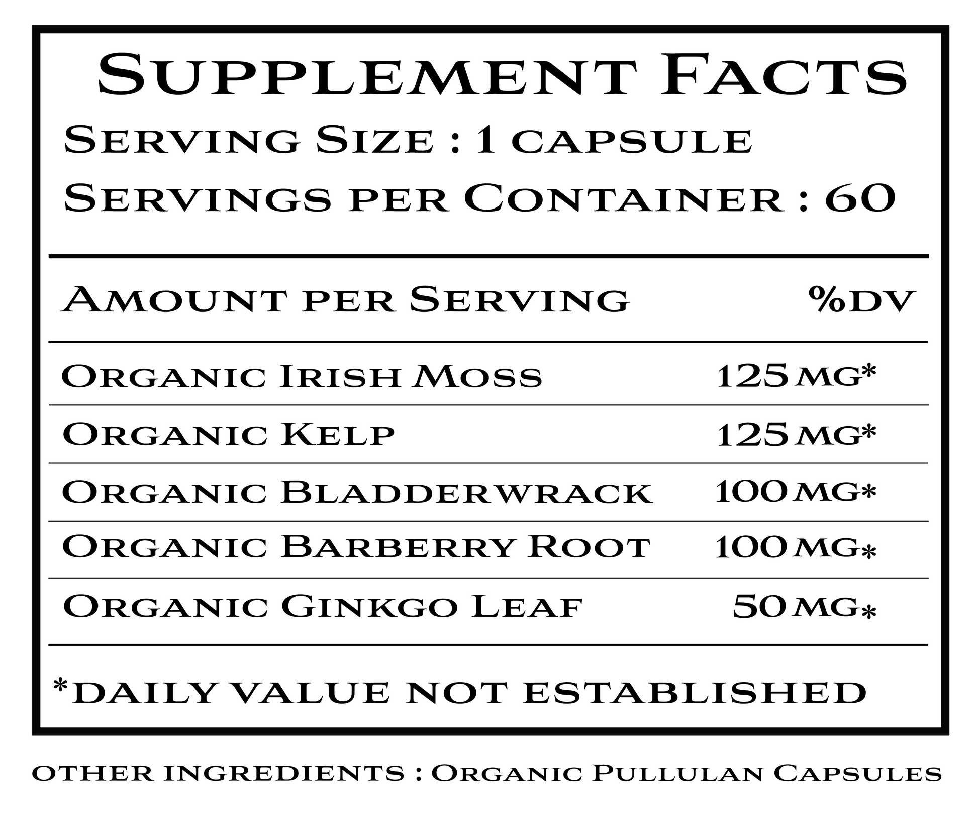 Ingredients: Organic Irish Moss, Organic Kelp, Organic Bladderwrack, Organic Barberry Root, Organic Ginkgo Leaf