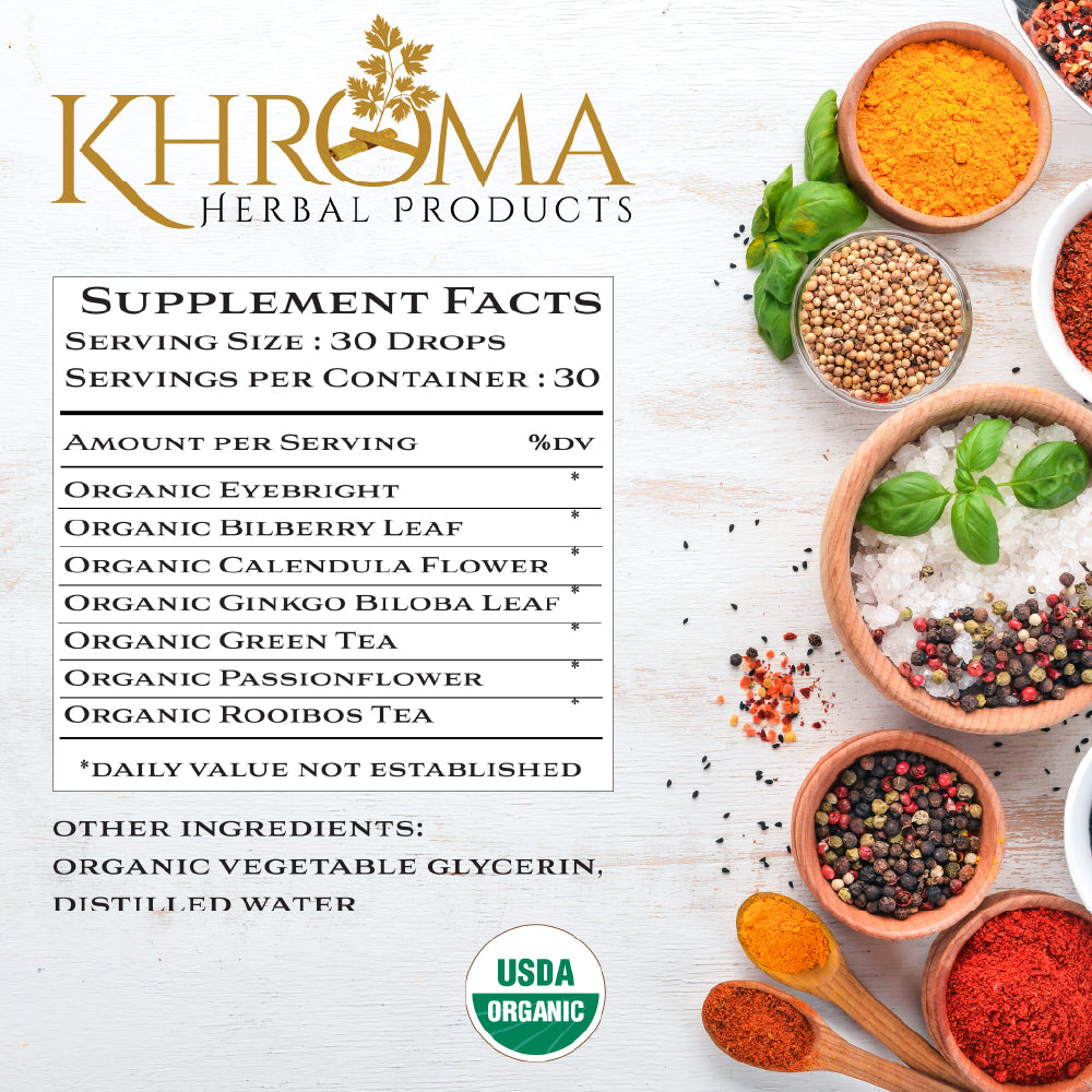 INGREDIENTS: (ALL ORGANIC) passion flower,  bilberry, ginkgo biloba, eyebright, green tea, calendula, rooibos (asphalatus)