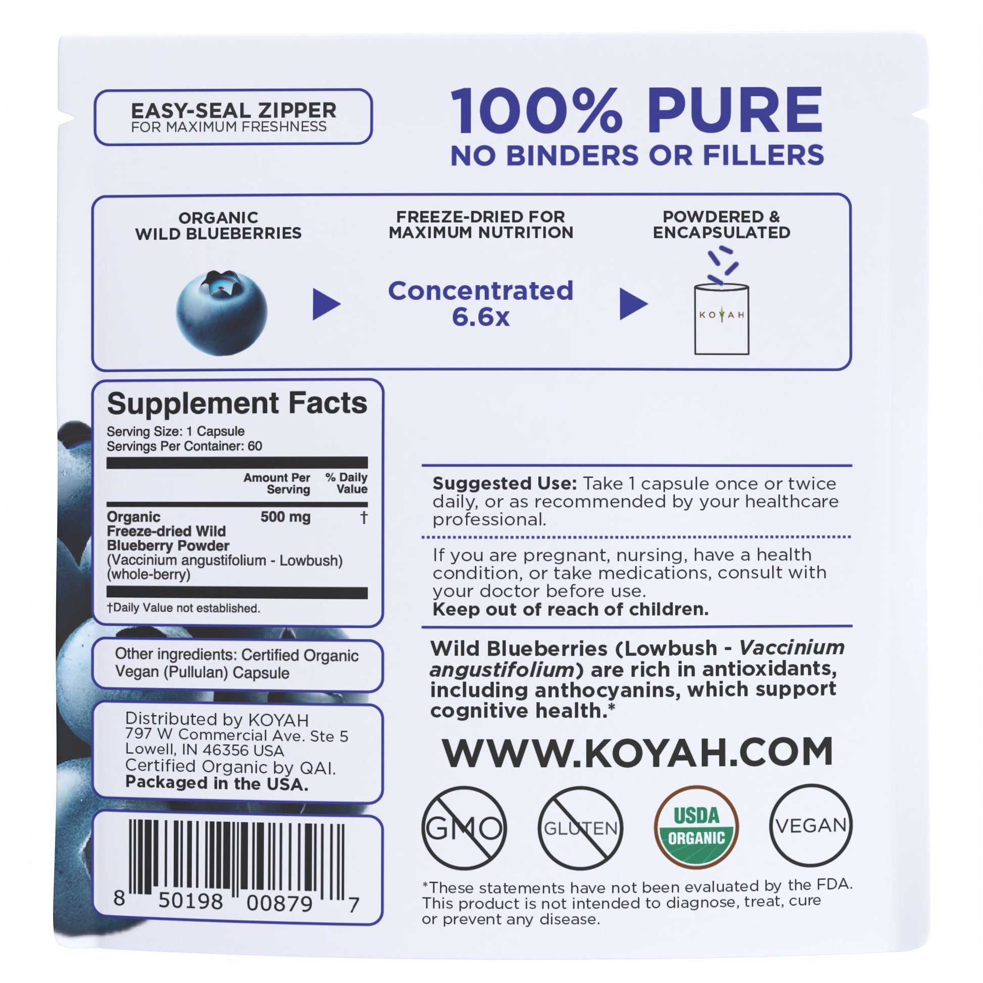 Organic Wild Blueberry Capsules – Our organic wild blueberry capsules start out as Canadian-grown, fresh, whole, organic wild blueberries. They are harvested, immediately frozen, and freeze-dried to preserve the maximum nutrition, vibrant color, and natural antioxidants. The berries are then finely powdered, encapsulated, and packaged. As a final step they are 3rd party tested for quality and safety.