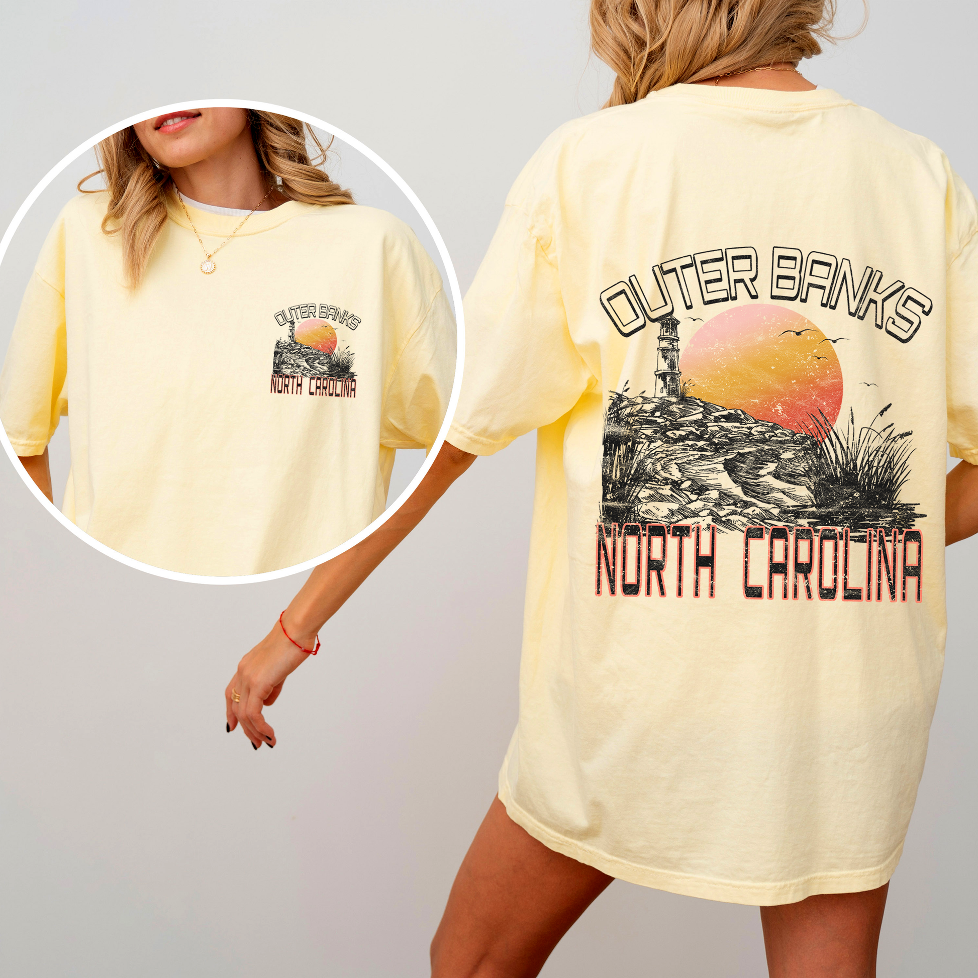Eye-Catching Design: Featuring a stunning front and back print that captures the essence of OBX summers, this t-shirt is more than just apparel; it's a statement. The vibrant visuals embody adventure and are sure to spark conversations and bring smiles.