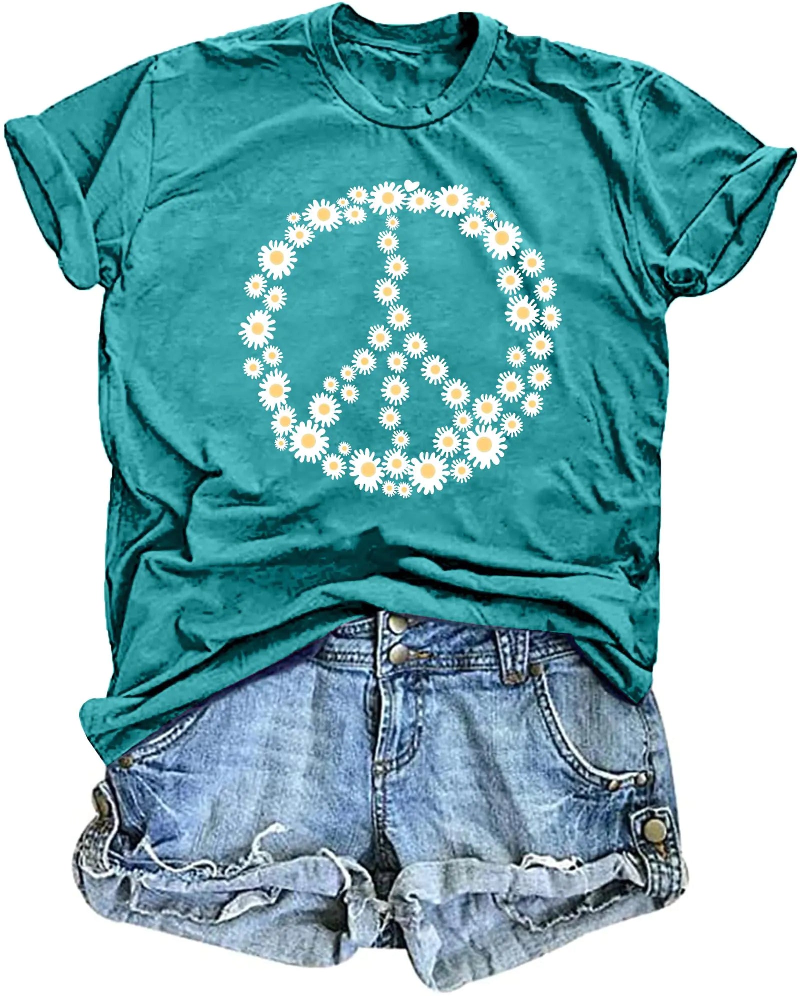 Peace Sign Love T-Shirt for Women Flower Graphic Shirt Hippie Short Sleeve 60s 70s Shirt Inspirational Tee Tops(CyanX-Large)