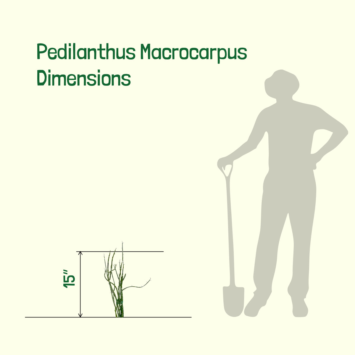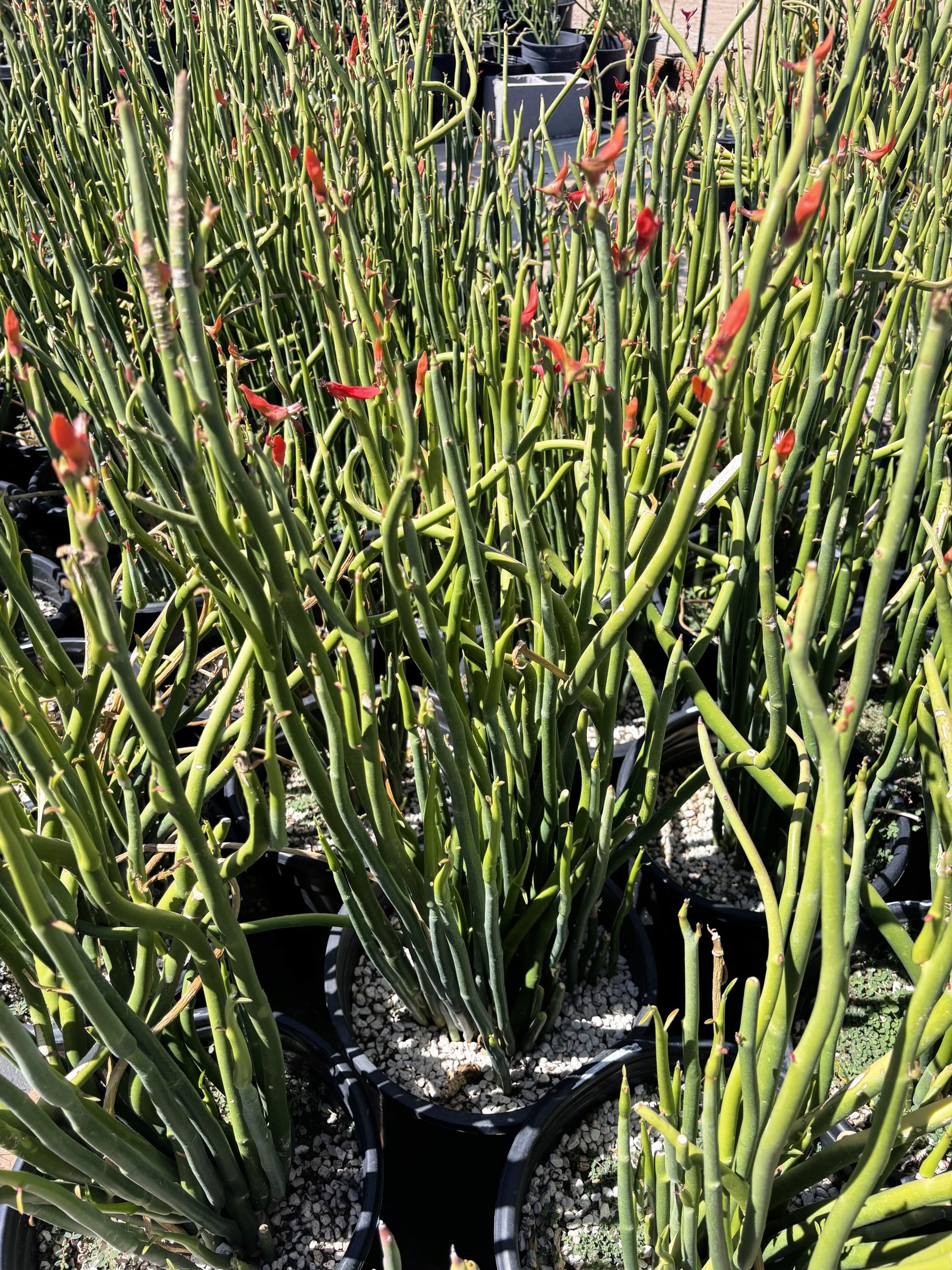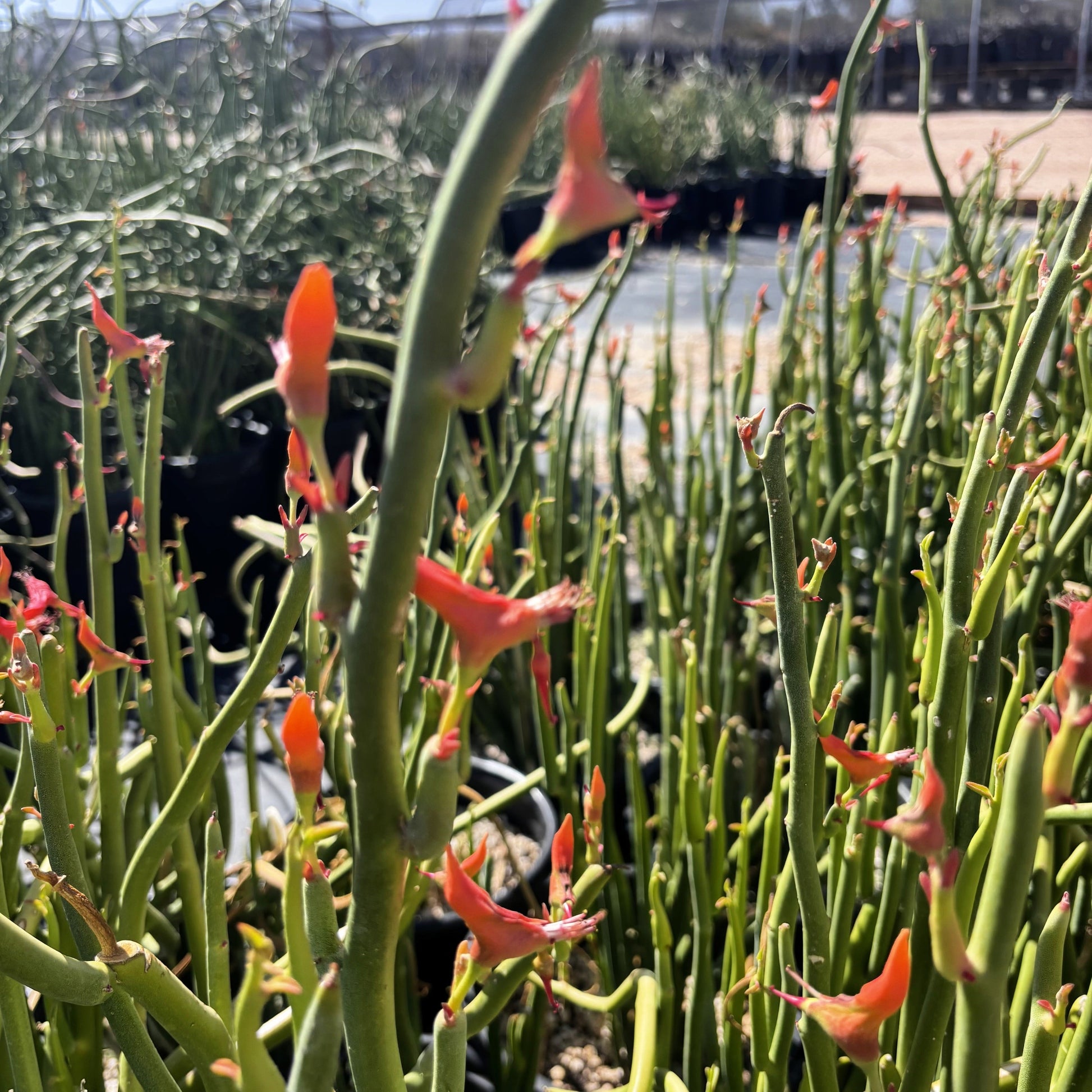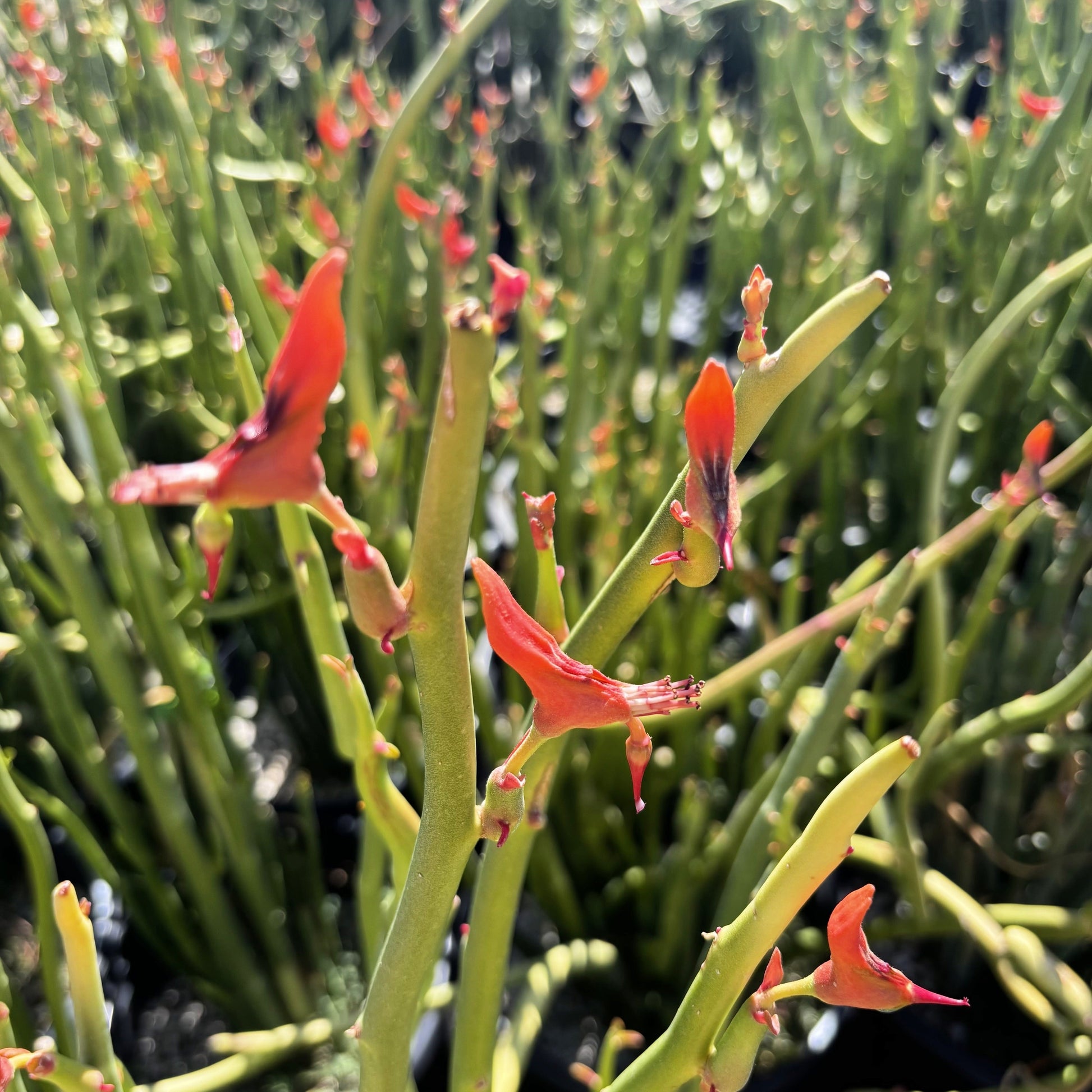 Succulent from Baja. Pencil like green stems grow to 3' high and 3' wide. Common name is "lady slipper", named after the hummingbird friendly red flower that looks like a slipper. Blooms all summer long Each plant is 8 stems minimum