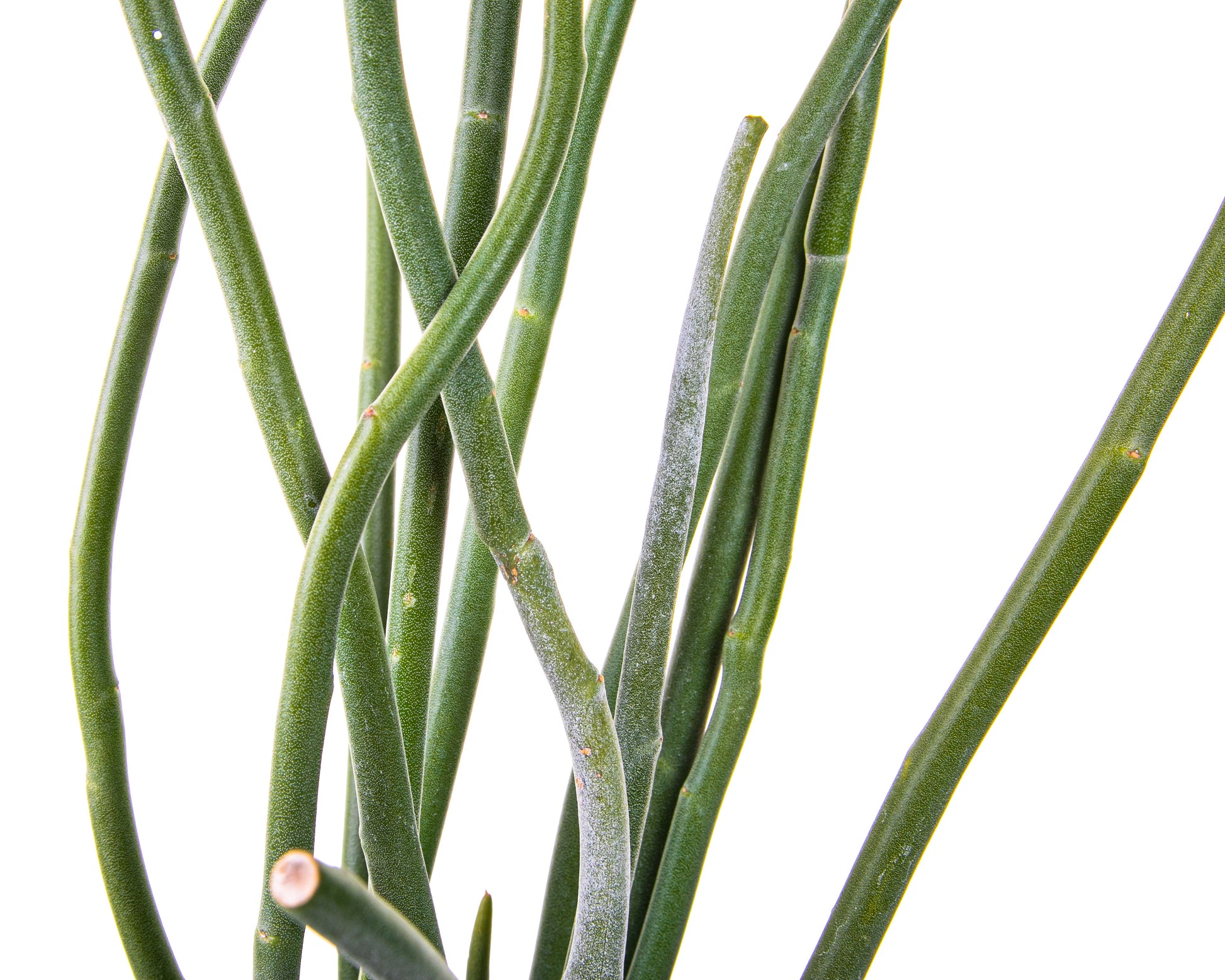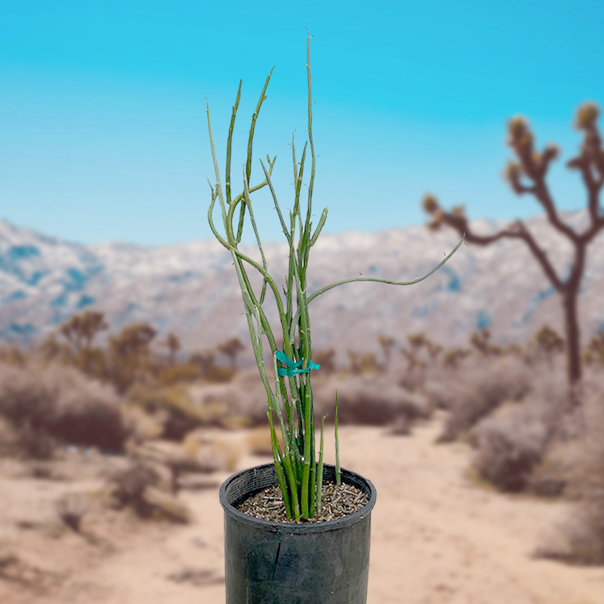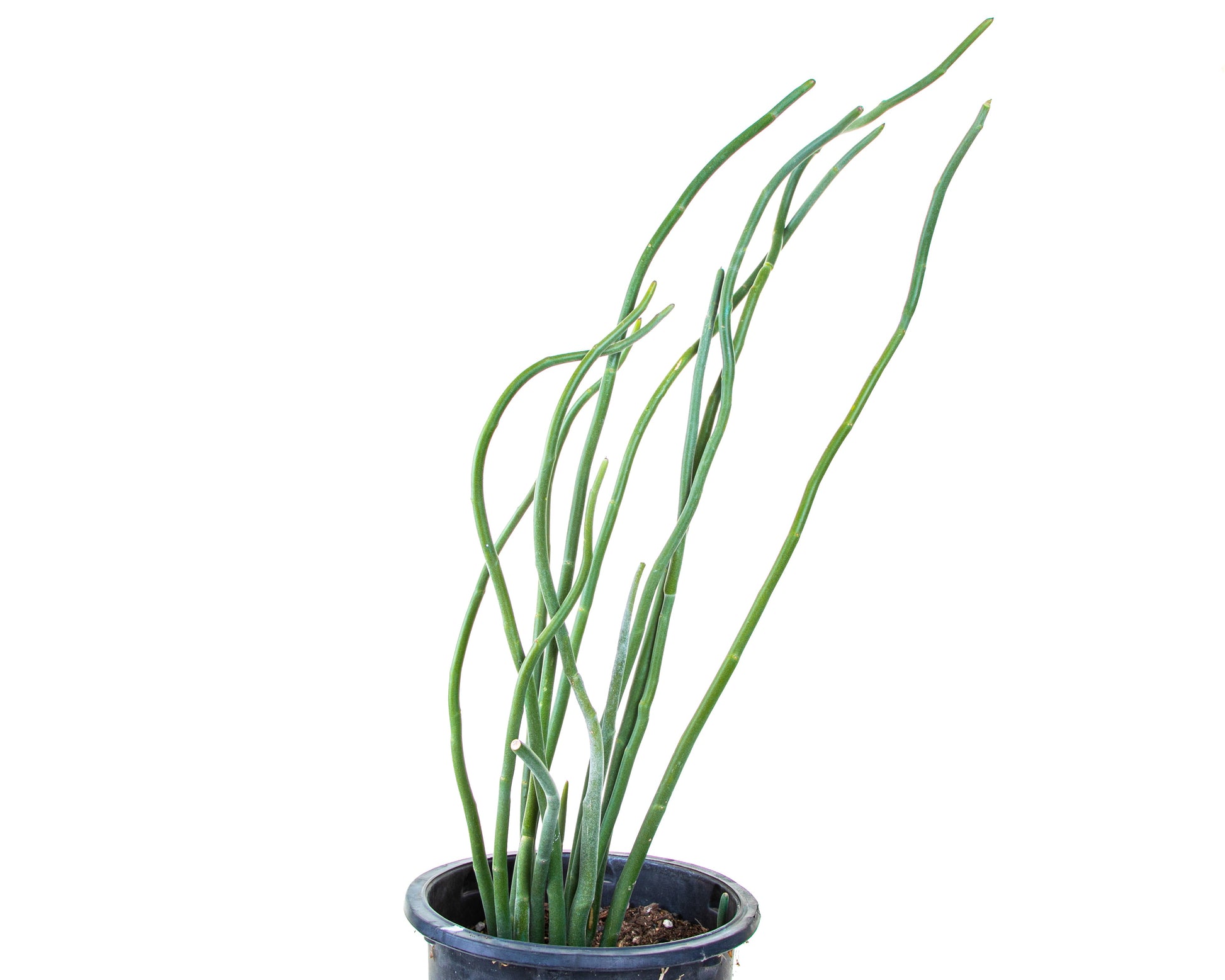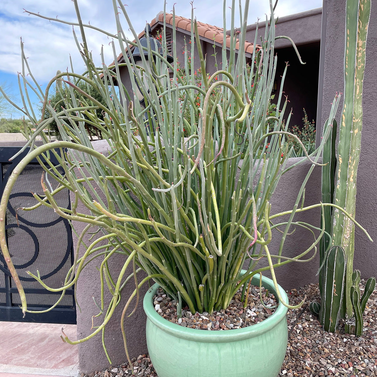 Succulent from Baja. Pencil like green stems grow to 3' high and 3' wide. Common name is "lady slipper", named after the hummingbird friendly red flower that looks like a slipper. Blooms all summer long Each plant is 8 stems minimum